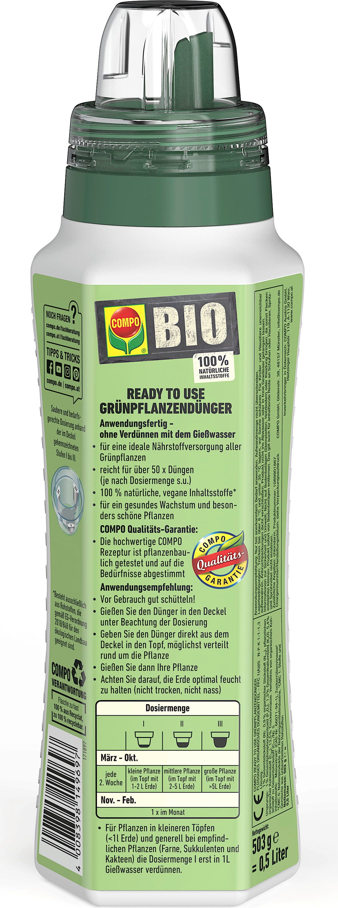 COMPO BIO Ready-to-Use gnojilo za zelene rastline vašim rastlinam neposredno zagotavlja vsa bistvena hranila – redčenje ni potrebno. Naravne sestavine spodbujajo močne, vitalne zelene rastline in zagotavljajo lepo barvo listov. Idealno za sobne rastline, balkonske rastline, lončnice in ekološke vrtove. Praktično, trajnostno in pripravljeno za uporabo.