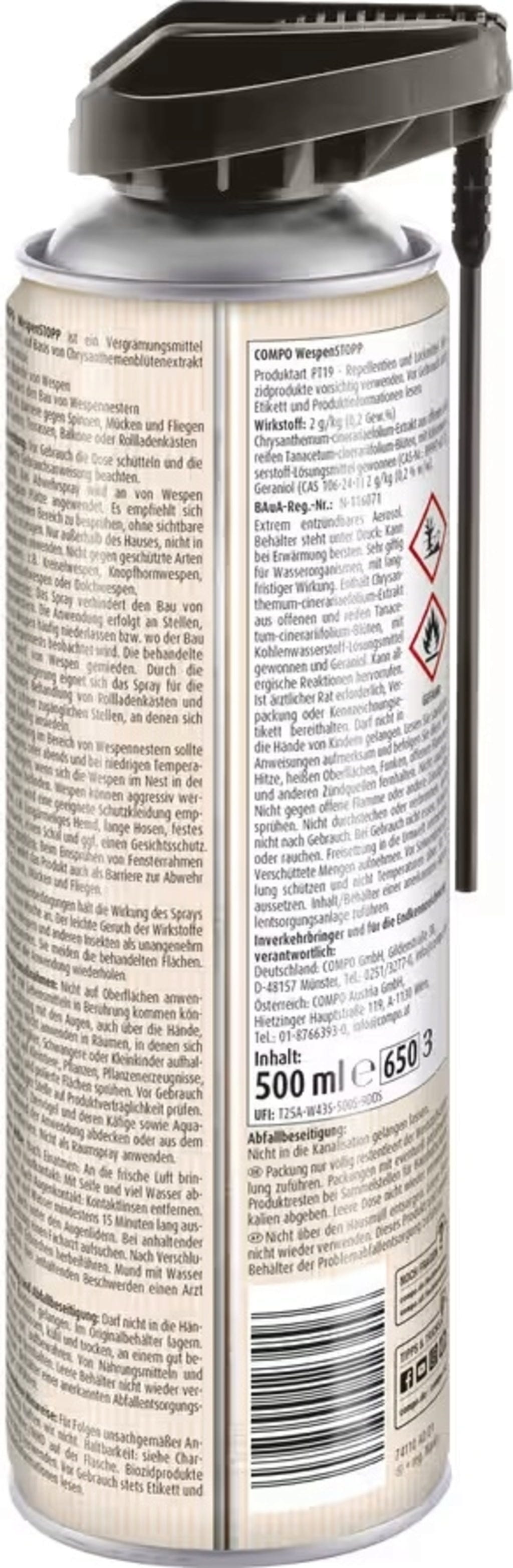 COMPO sprej za zaščito pred osami deluje z naravnimi aktivnimi sestavinami in inovativno tehniko pršenja. Ne glede na to, ali sprej nanesete na določeno mesto ali na veliko površino, je njegova uporaba preprosta in preprečuje, da bi se ose sploh naselile. Hkrati odganja druge žuželke, tako da lahko nemoteno uživate v poletnih mesecih na prostem.