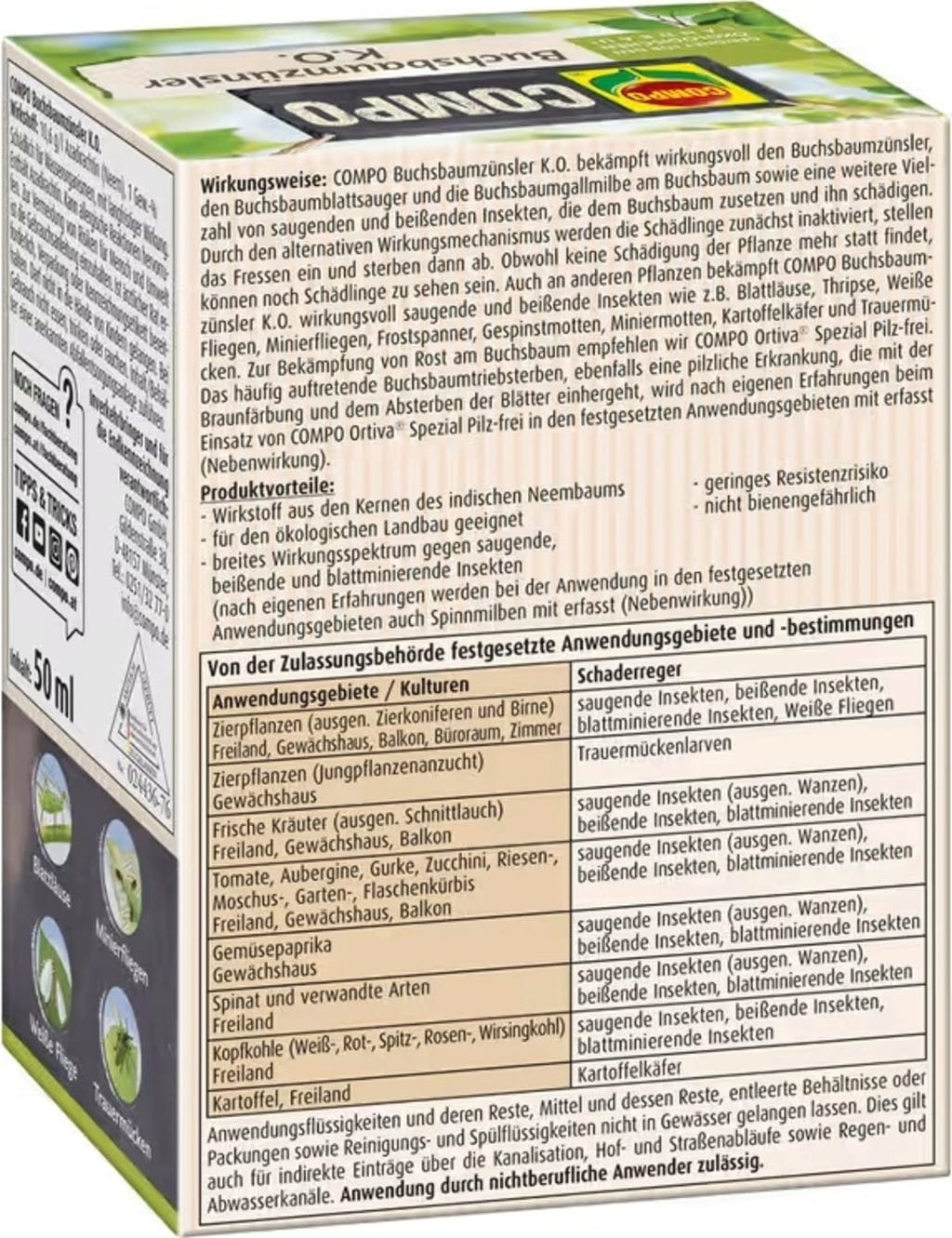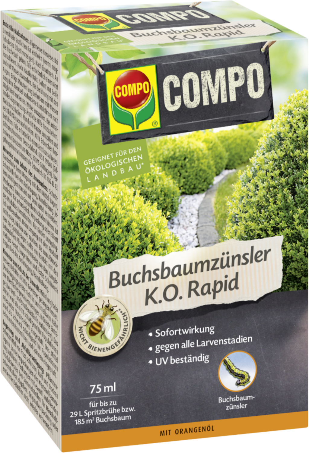 COMPO sredstvo proti pušpanovi vešči K.O. Rapid zanesljivo ščiti pušpane pred napadom pušpanove vešče in drugih sesajočih ali grizečih žuželk. Naravna aktivna sestavina iz semen indijskega drevesa neem deluje hitro in učinkovito, ne da bi poškodovale rastlino. Tako ohranja pušpane zdrave in zaščitene pred poškodbami žuželk.