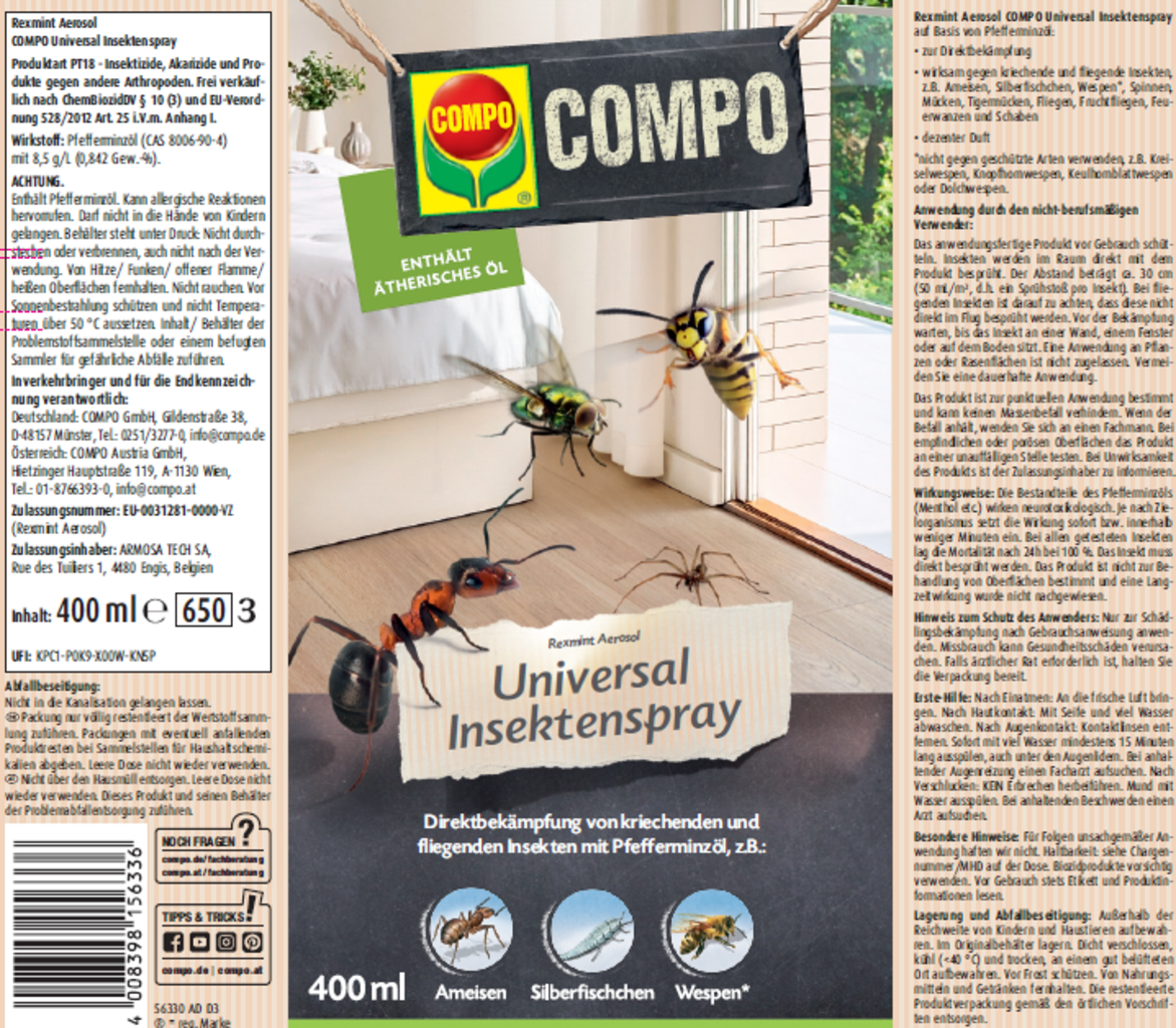 COMPO univerzalno razpršilo proti insektom je zanesljiva rešitev za neposredno zatiranje mravelj, srebrnih ribic, pajkov, komarjev, os, muh in drugih žuželk. Formulacija na osnovi olja poprove mete ima ciljno usmerjen učinek, je prijetno dišeča, hkrati pa zaradi inovativnega sistema razprševanja zagotavlja natančno nanašanje. Idealno za dnevne sobe, kleti, kuhinje ali druge notranje prostore, kjer želite učinkovito in diskretno zatirati insekte.