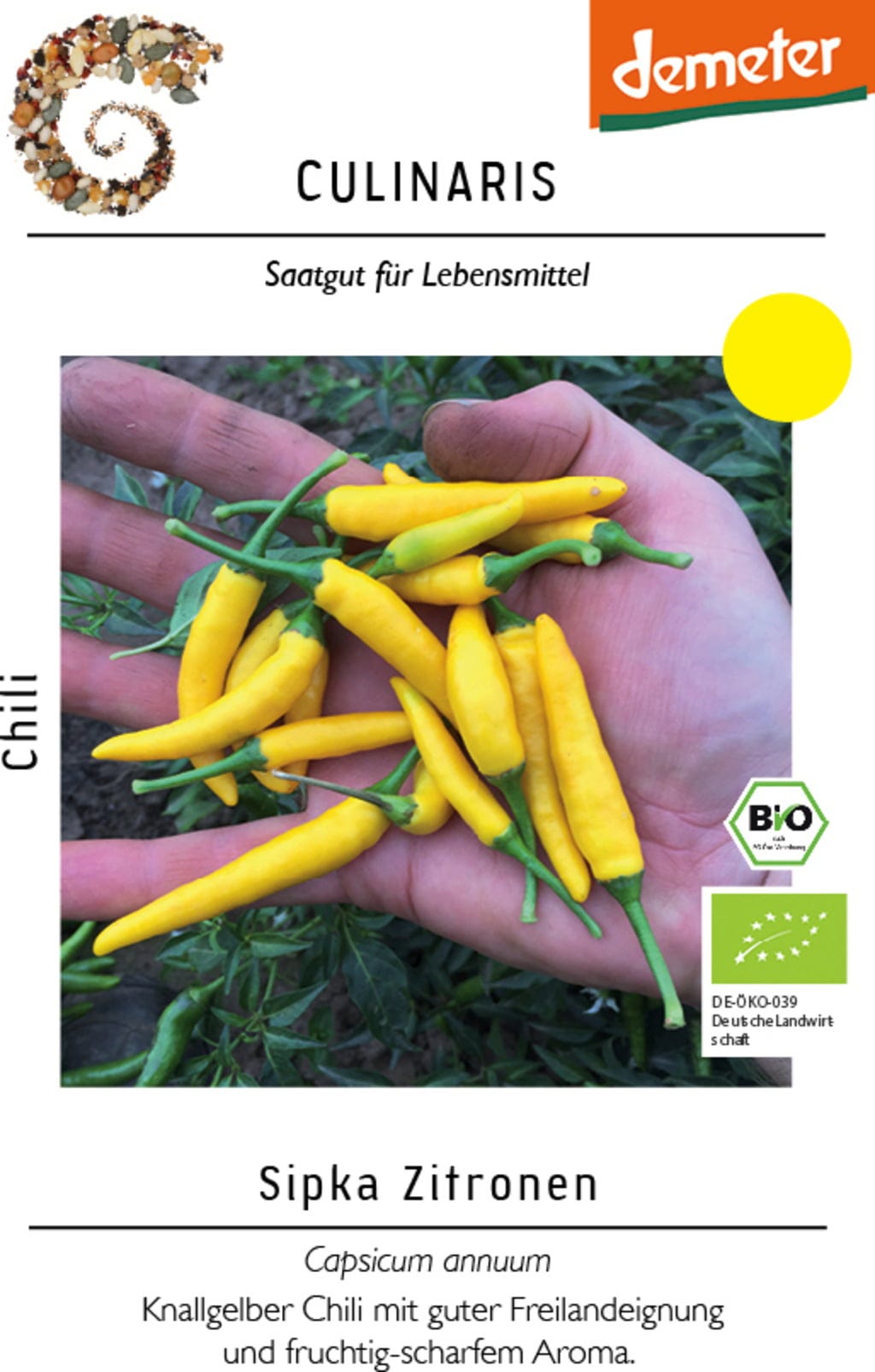 Čili "Sipka Zitrone" je robusten in donosen čili za gojenje na prostem s svetlo rumenimi, koničastimi plodovi. Njegova eksotična sadna aroma in srednja stopnja pekočnosti omogočata vsestransko uporabo – idealen je za sušenje v živo rumen čili v prahu ali kot posebna začimba v karijih. Zahvaljujoč zgodnjemu dozorevanju in enostavni vzgoji zanesljivo obrodi okusne plodove.