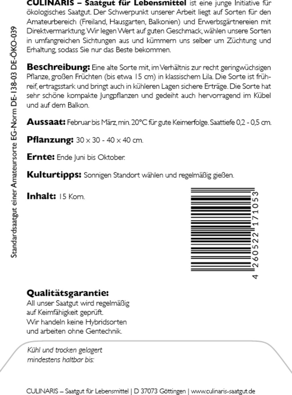 | Proizvajalec: | Culinaris - Saatgut für Lebensmittel, Thiegasse 5, 37124, Rosdorf, Nemčija, info@culinaris-saatgut.de, culinaris-saatgut.de |