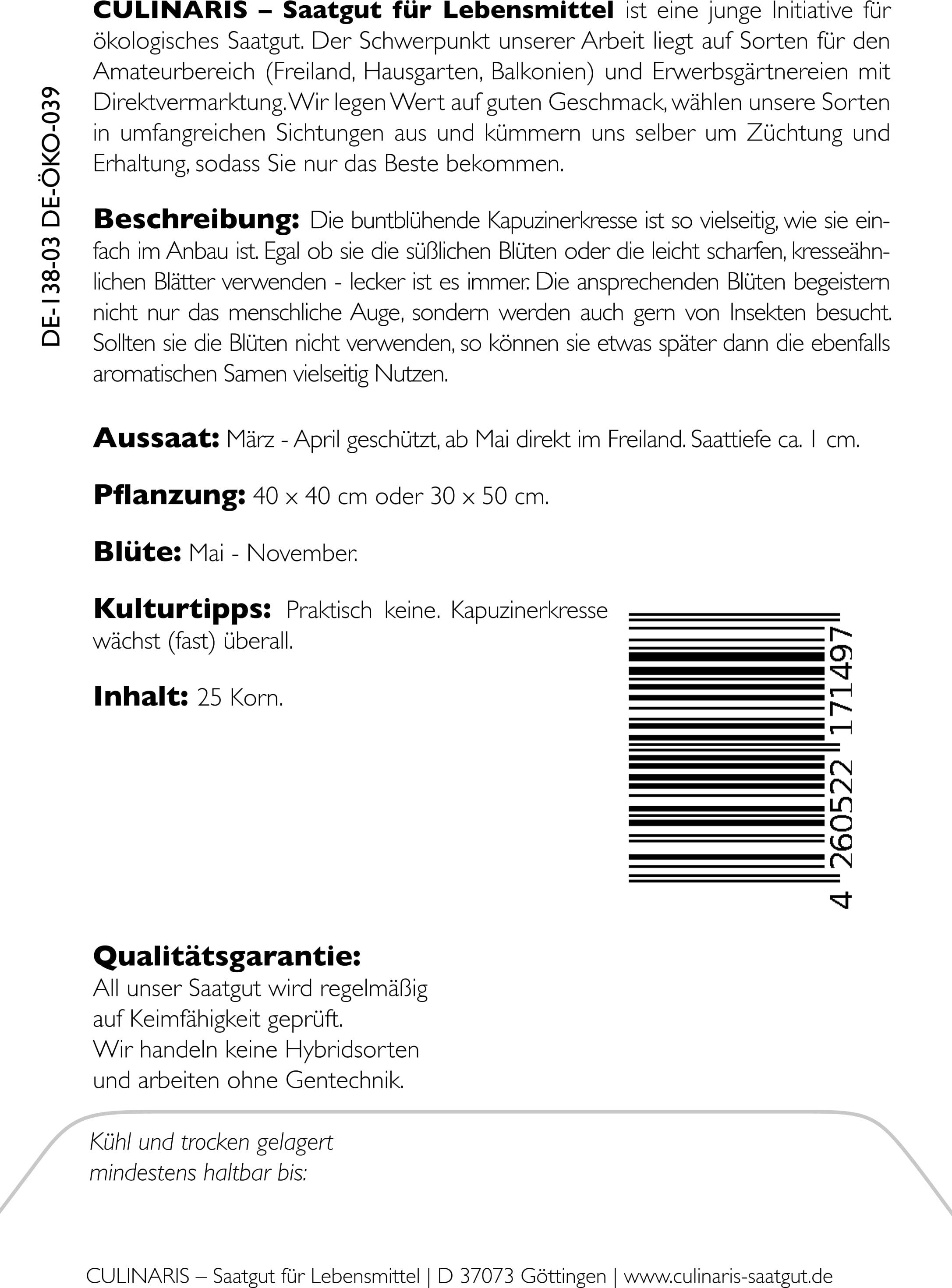 | Proizvajalec: | Culinaris - Saatgut für Lebensmittel, Thiegasse 5, 37124, Rosdorf, Nemčija, info@culinaris-saatgut.de, culinaris-saatgut.de |