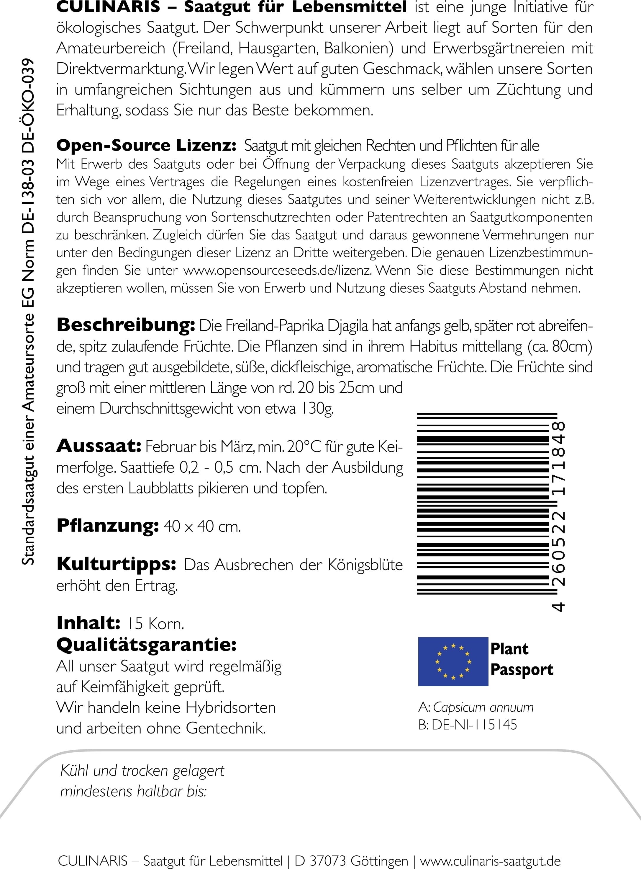 Paprika "Djagila" je zgodaj dozorevajoča, aromatična paprika z velikimi, koničastimi plodovi. Rastline so srednje velike, robustne in rodijo neprekinjeno od julija do novembra. Idealna je za sveže uživanje, konzerviranje ali predelavo v prah. Zahvaljujoč odprtokodni licenci se lahko semena prosto delijo.
