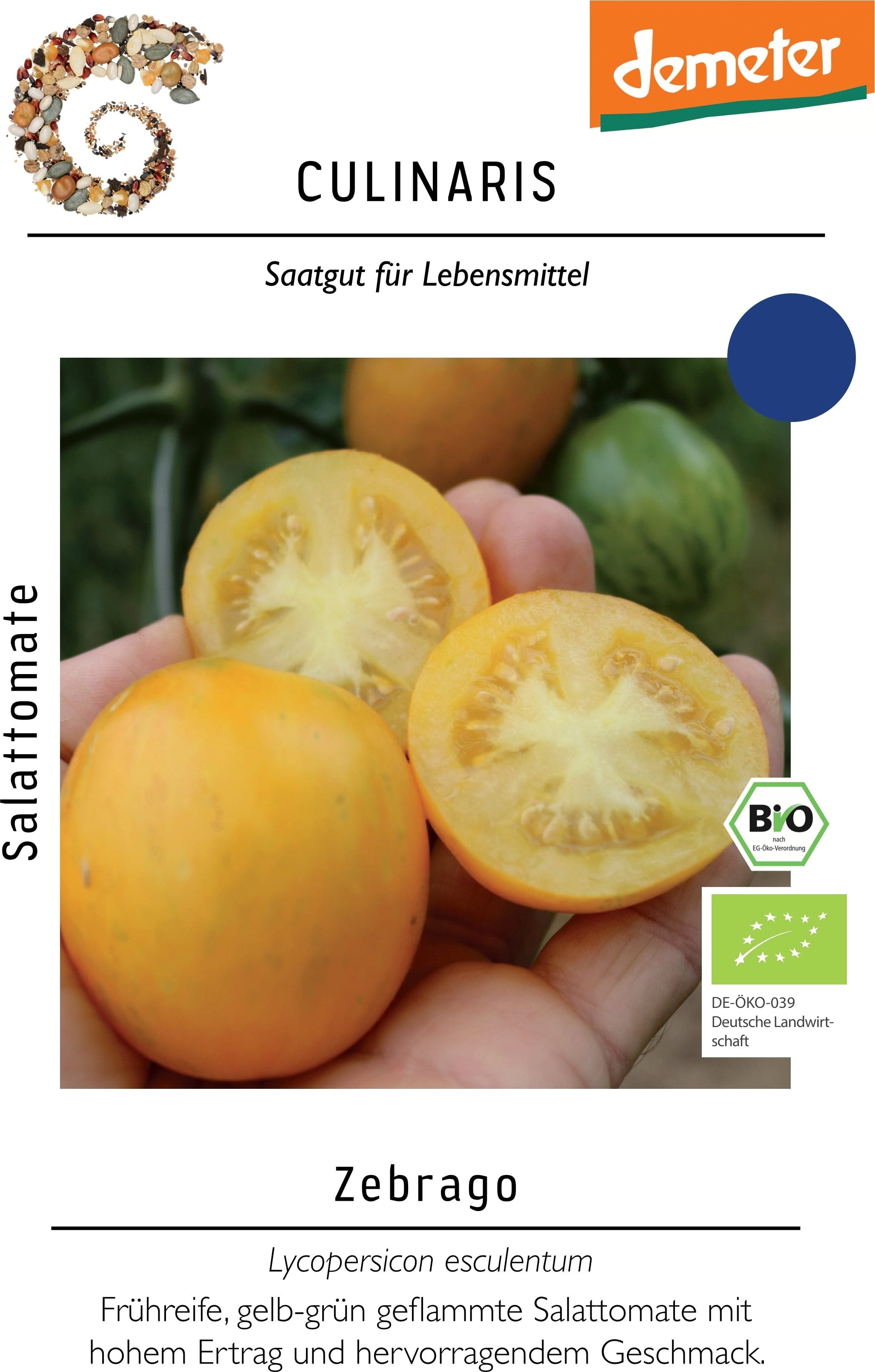 Paradižnik "Zebrago" je zgodaj zoreč, rumeno-zelen solatni paradižnik z izjemnim okusom. Rastline so bujne, zdrave in visokorodne. Idealen je za zaščiteno gojenje v rastlinjakih ali pod pokritimi površinami. Od junija naprej daje aromatične, dolgo obstojne plodove za sveže solate.