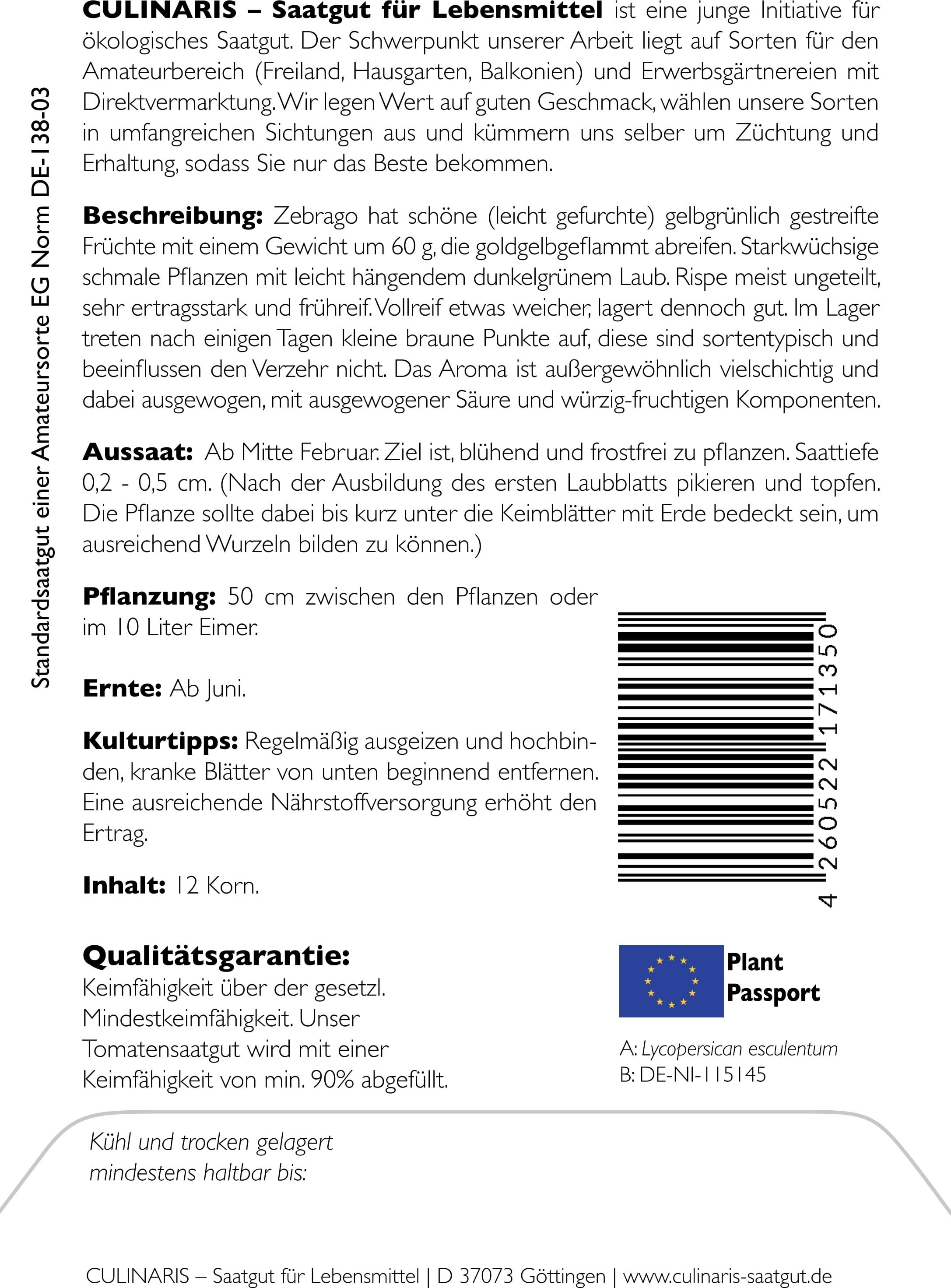| Proizvajalec: | Culinaris - Saatgut für Lebensmittel, Thiegasse 5, 37124, Rosdorf, Nemčija, info@culinaris-saatgut.de, culinaris-saatgut.de |
