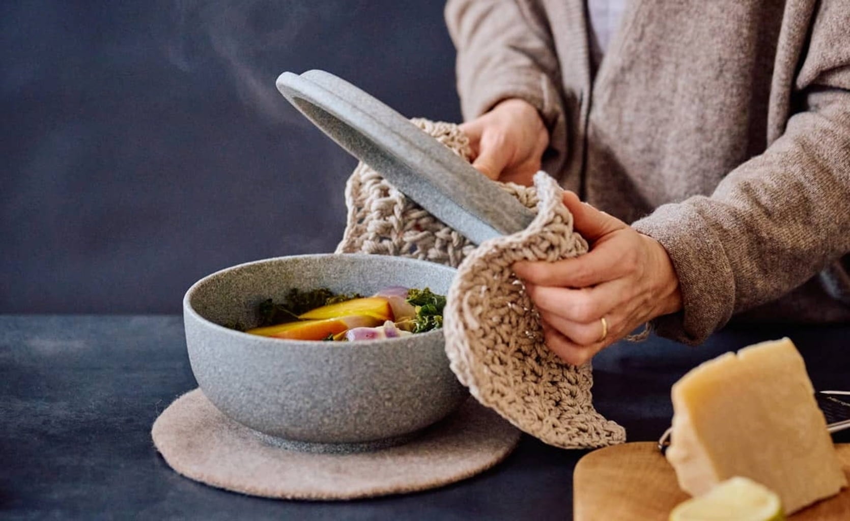 Uporaba v pečici: Predhodno dodajte malo vode in kuhajte z ventilatorskim načinom. To ustvari vročo paro pod pokrovom, medtem ko keramika zadrži toploto in jo oddaja zelenjavi. Minimalna količina vode zagotavlja veliko manjšo porabo energije kot pri kuhanju v loncu.