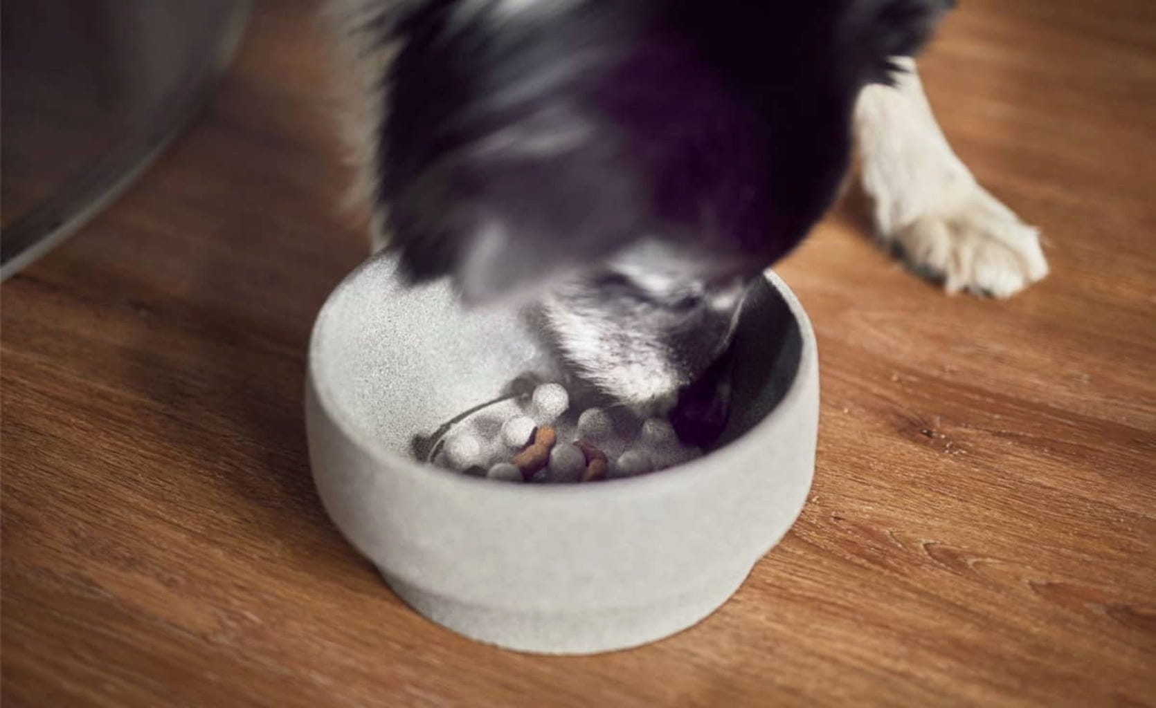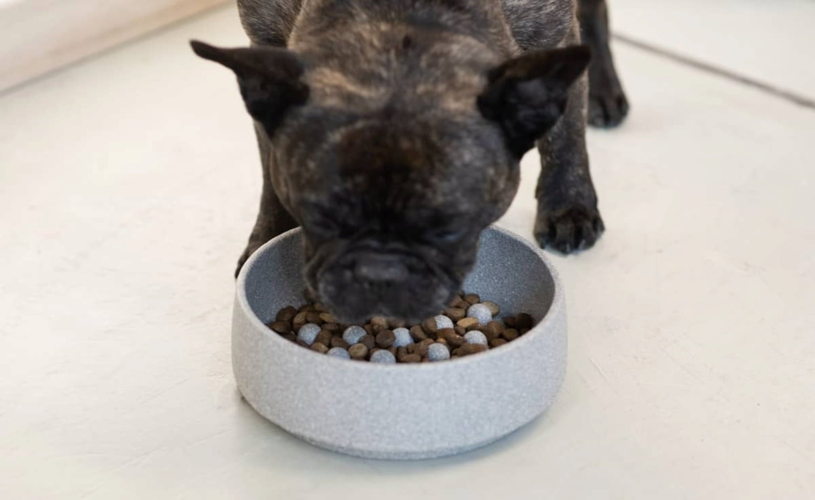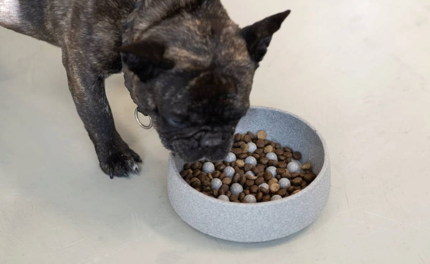 Popoln dodatek za posodo za pse Granicium®. Vložek, narejen iz keramične ploščice z izboklinami, je v skledo nameščen brez pritrditve, kar upočasni hranjenje in prepreči goltanje. Na keramični ploščici si lahko pes tudi očisti jezik.