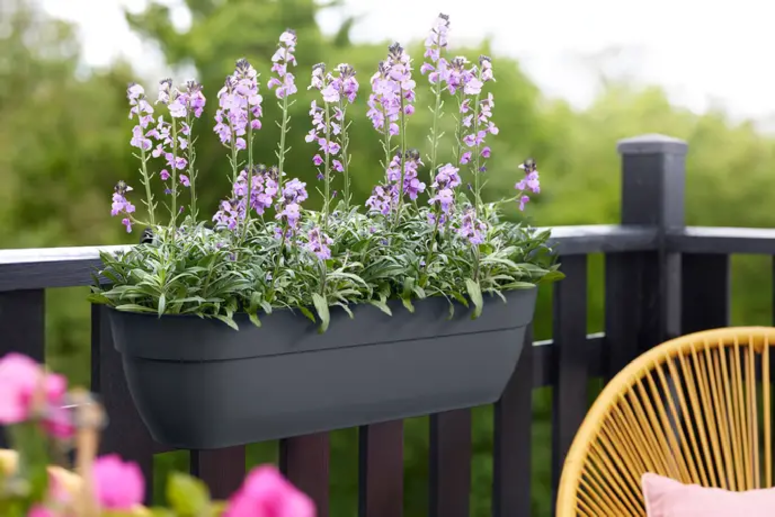 Balkonsko korito vibia campana easy hanger XXL spremeni vaš balkon v zeleni raj. Enostavno je za montažo, stabilno in primerno za ograje širine do 6,5 cm. Integrirane drenažne cevi zagotavljajo, da bodo vaše rastline ostale zdrave, medtem ko je balkonsko korito odporno na vremenske vplive, barvno obstojno in enostavno za čiščenje. Narejeno je iz 100 % reciklirane plastike in trajnostno proizvedeno z uporabo vetrne energije.