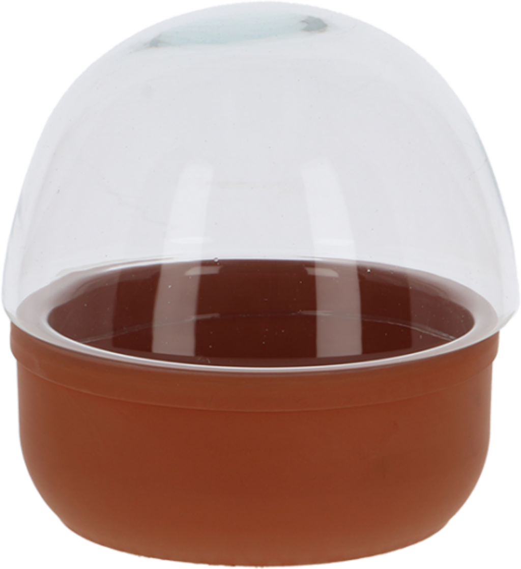 Rastlinski terarij združuje naravno terakoto s prozornim steklom, kar ustvarja eleganten videz za majhne rastline ali okrasne aranžmaje. Zaradi svoje preproste oblike se odlično poda v sodobne bivalne in vrtne prostore ter hitro postane dekorativni element.