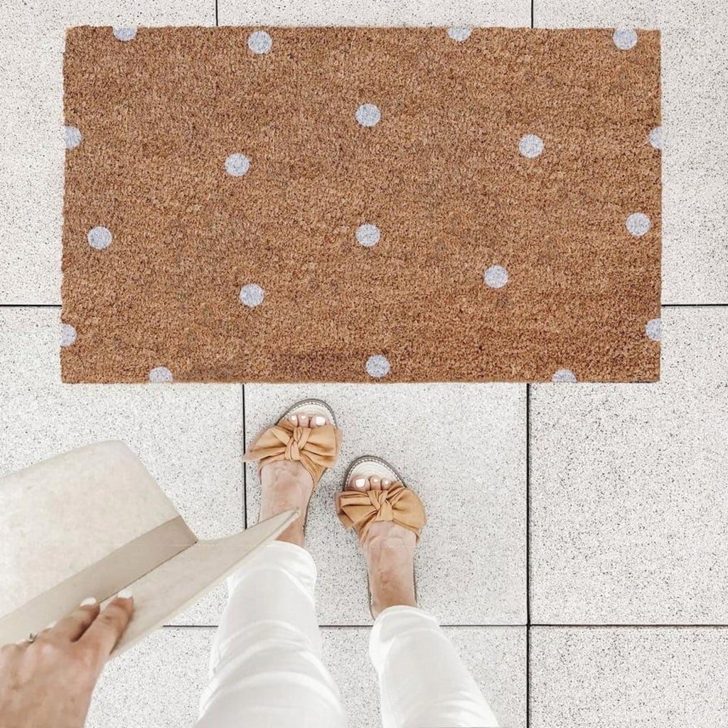Predpražnik iz visokokakovostnih kokosovih vlaken v veselem pikčastem dizajnu prisrčno sprejme vaše goste in vas spravi v dobro voljo. Zaradi naravnega videza in elegantnega zaključka so čudovite preproge popolna izbira za vsak vhod in garderobo. Tudi odlična ideja za darilo za otvoritev hiše ali stanovanja.