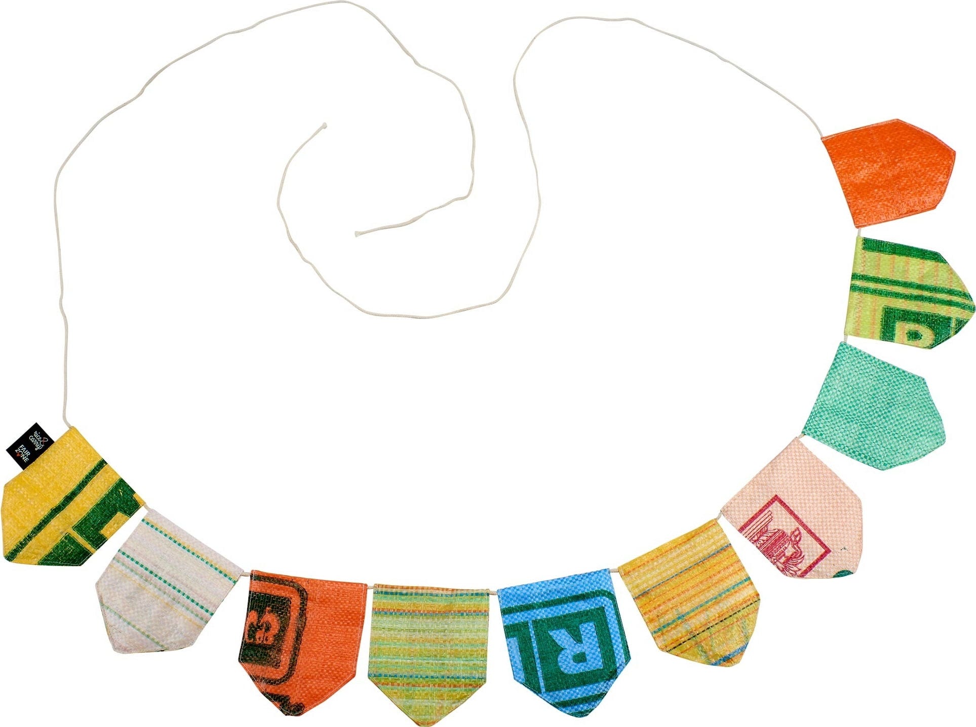 Preoblikujte svoj zunanji prostor v prostor, poln veselja do življenja, in se zanesite na pristno izdelavo z značajem! Ta edinstvena girlanda bo s svojimi živahnimi barvami takoj vnesel praznično vzdušje na vašo naslednjo vrtno zabavo, zaradi robustnega recikliranega materiala pa bo zlahka prenesla tudi rahel dež. Vsaka od desetih petkotnih zastavic pripoveduje svojo zgodbo, saj so bile ročno izdelane iz rabljenih riževih vreč na Šrilanki - zato v rokah držite resnično unikaten izdelek, ki ga ni mogoče najti nikjer drugje.