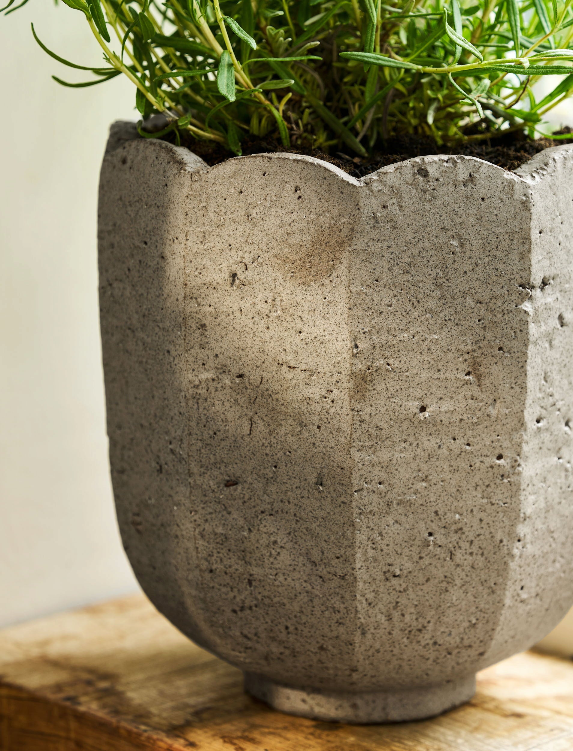 Z modernim cementnim videzom se ta cvetlični lonec popolnoma prilega različnim notranjim slogom, od podeželskega do industrijskega. Navdihnjen z okroglimi oblikami školjk, izžareva prijetno toplino in lepo poudari vaše sobne rastline.