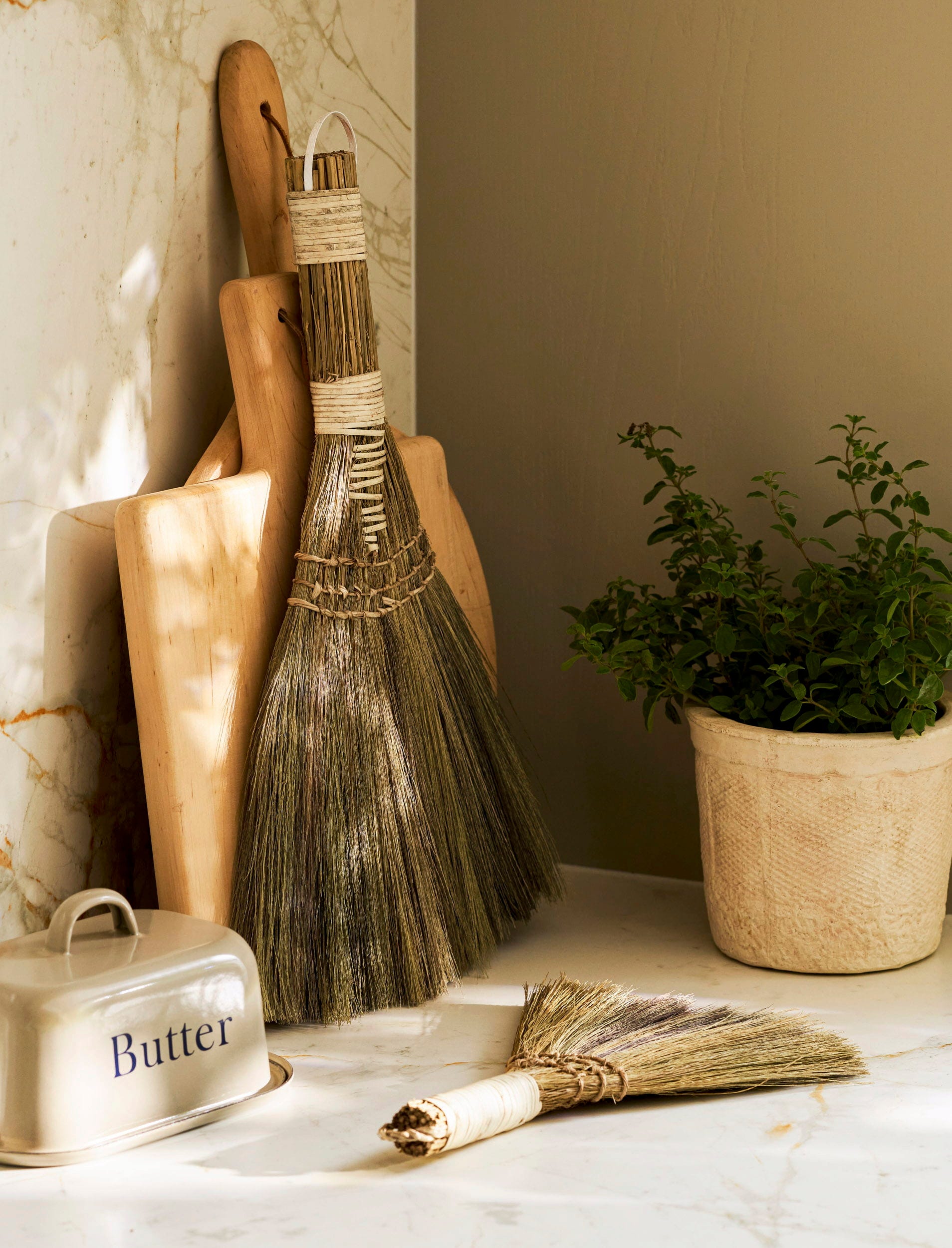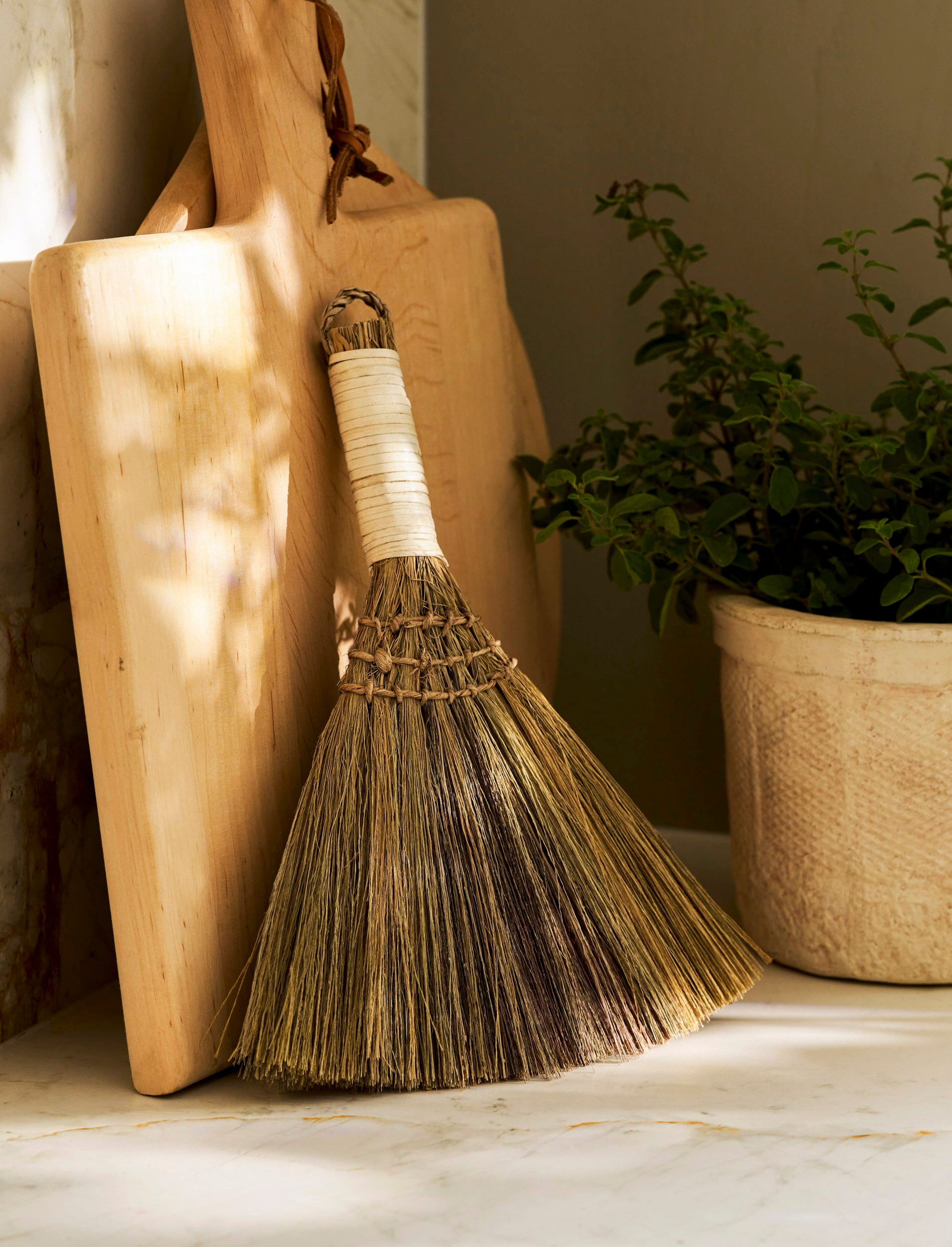 Ta namizna metla je eleganten način za pometanje drobtin z miznih in kuhinjskih površin. Izdelana je iz naravne morske trave, ima ovit ročaj in priročno zanko za obešanje. To omogoča, da jo obesite na kavelj v kuhinji ali shrambi, ko ni v uporabi, kar prihrani prostor in doda dekorativni pridih.
