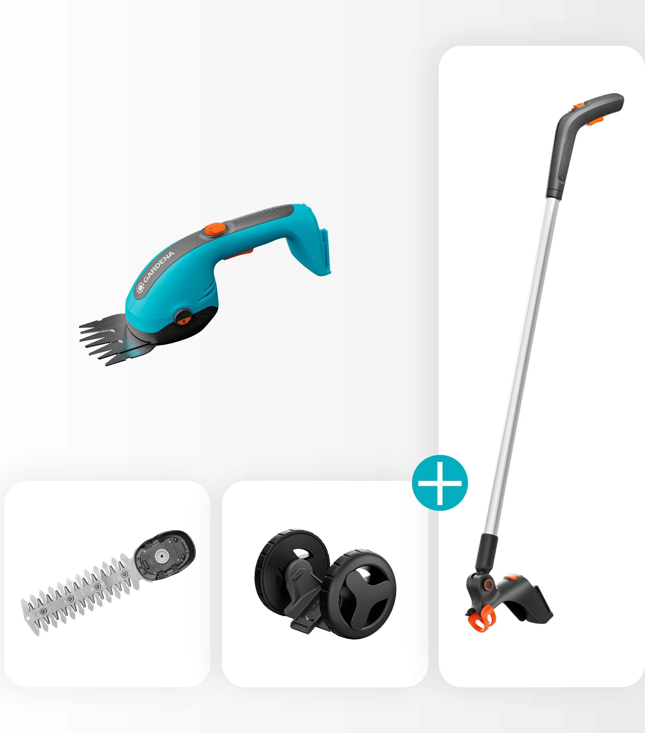 Če želite preklopiti s prirezovanja trate na oblikovanje grmičevja, lahko rezila zamenjate brez orodja in v nekaj sekundah. V kombinaciji s priloženim ročajem v kompletu lahko robove trate urejate kar udobno stoje, kar bo razveselilo vaš hrbet in vrtnarjenje spremenilo v sproščeno prostočasno dejavnost. Visokokakovostna natančna rezila vam pri tem vedno zagotavljajo čist rez, prijazen do rastlin, za vrt kot izpod rok profesionalca.