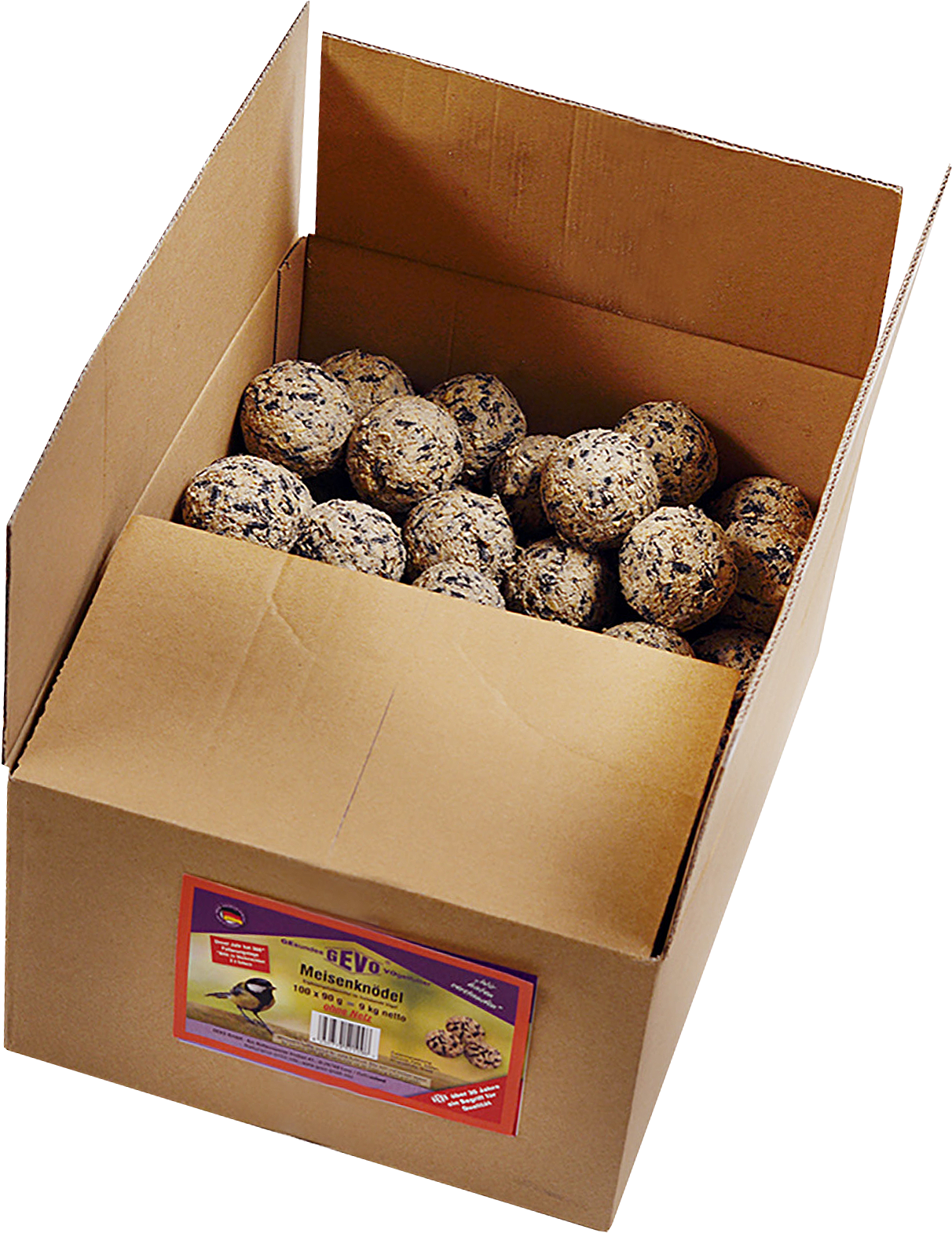 - Narejeno iz ovsenih in pšeničnih kosmičev, energijsko in maščobno bogatih arašidovih koščkov, sončničnih semen, govejega loja in svinjske masti
