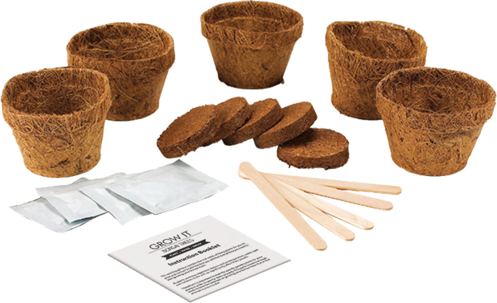 Vsebina seta: začetni cvetlični lončki iz kokosovih vlaken, blazinice s substratom, markerji in semena za 5 rastlin