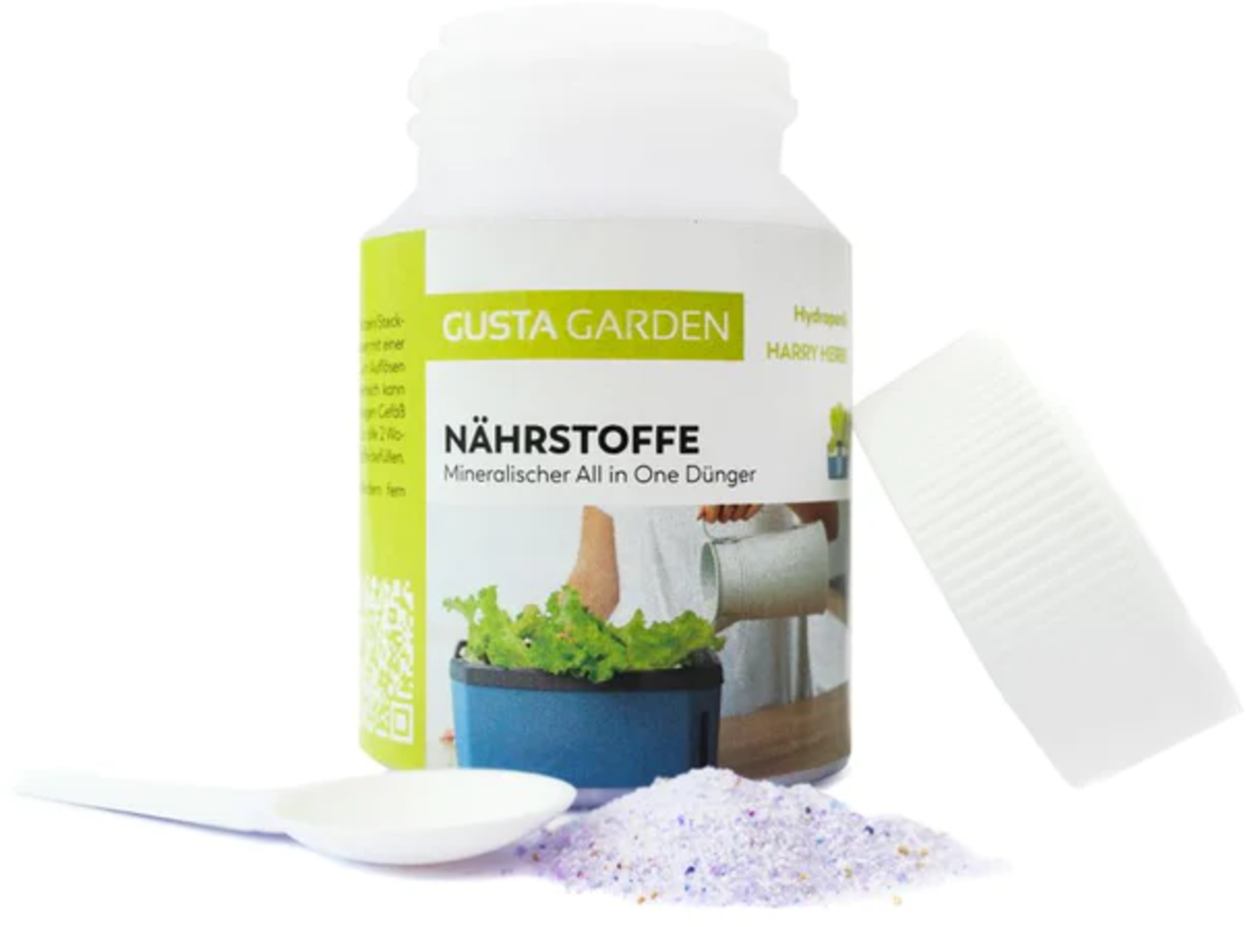 Za potaknjence in mlade rastline: Dodajte 2,5 g hidroponskih hranil v 5 litrov vode (temperatura 18-22 °C) in 2 do 3 minute temeljito mešajte. Posodo HARRY HERBS napolnite s to mešanico vsaka dva tedna. Mešanico lahko shranjujete v neprozorni posodi do 7 dni.