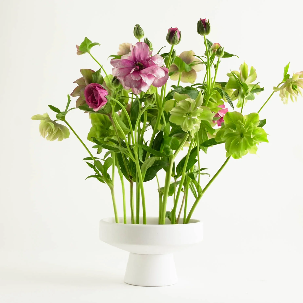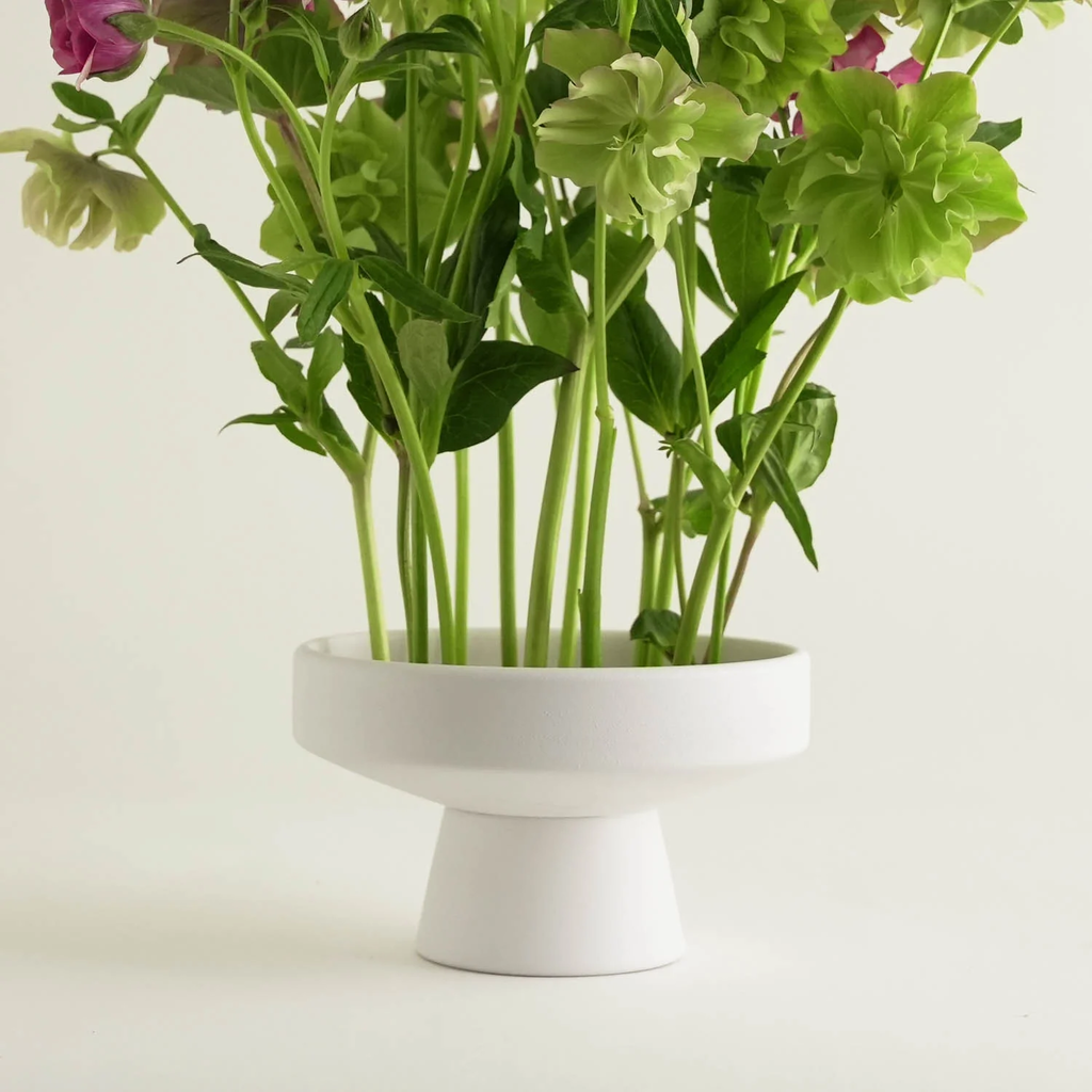 Naj bo to s svežim cvetjem, nežnimi vejicami ali okrasnim zelenjem – mat površina in minimalistična zasnova se harmonično zlijeta z vsakim ambientom in posodo za ikebane spremenita v eleganten osrednji element.