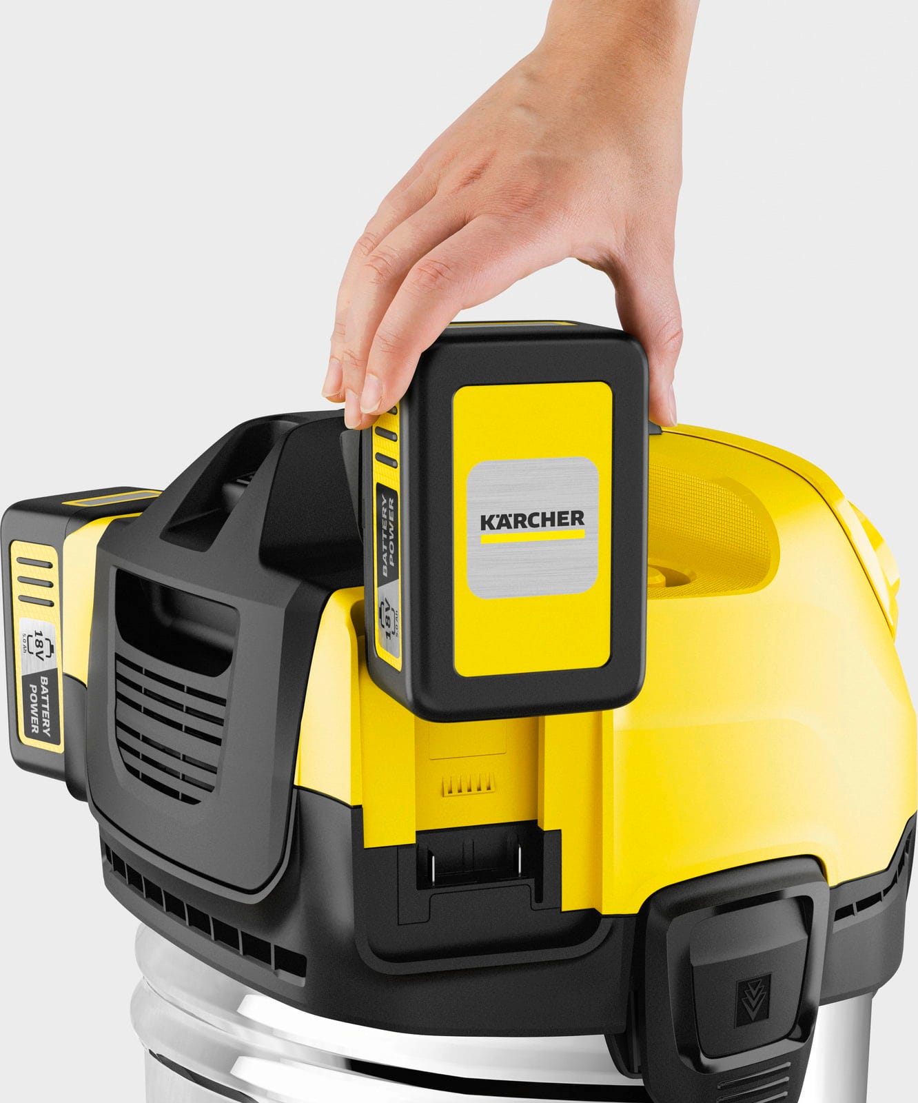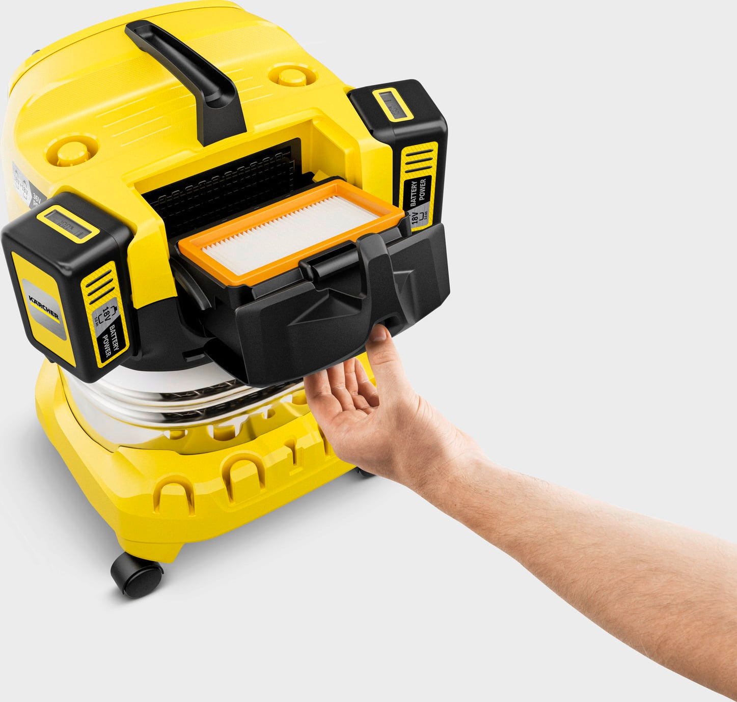 Sesalnik za mokro in suho sesanje Kärcher WD 4-18 S Dual Battery Set V-20/22 je zasnovan za čistilna opravila, pri katerih ni na voljo neposrednega električnega priključka ali pa bi bil kabel napoti. Napravo poganjata dve 18-voltni bateriji, deluje s 36-voltnim motorjem in nudi sesalno moč 100 vatov. 20-litrska posoda iz nerjavečega jekla zagotavlja zadostno kapaciteto za prah, grobo umazanijo ali tekočine.