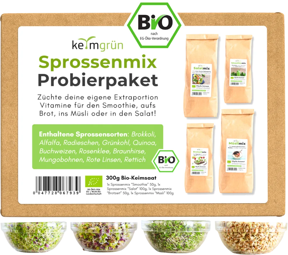 S priljubljeno bio mešanico kalčkov lahko vsakdanjemu življenju preprosto dodate sveže vitamine, barve in okuse. Na kruhu, v solati, v müslijih ali v smoothiju - vsaka mešanica je popolnoma uravnotežena glede okusa in časa kaljenja. Zdrava prehrana še nikoli ni bila tako preprosta: kalite, uživajte in se počutite dobro!
