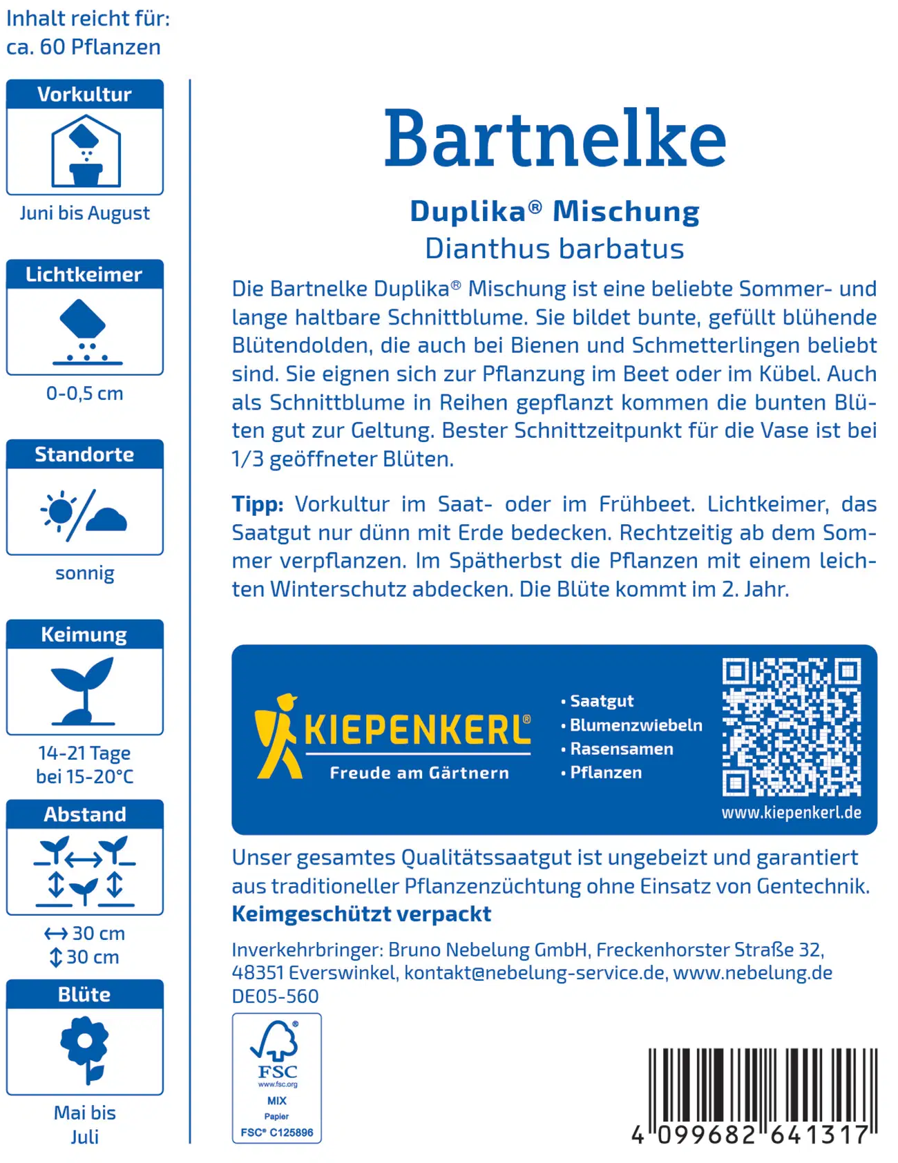 Brkati nageljčki "Duplika® Mix" prinašajo na vaš vrt živahne barve in vonj. Idealni so za grede, lonce ali kot rezano cvetje, saj privablja čebele in metulje ter zagotavljajo živahne poudarke. Možno je gojenje v gredah ali toplih gredah, svetlobno odvisna kalitev zahteva le tanko prekritje z zemljo, saditev od poletja naprej in pozno jeseni pa pokrijte z rahlo zimsko zaščito. Polno cvetoče razkošje se razvije v drugem letu - kot nalašč za vse, ki se veselijo cvetočega ambienta in obožujejo vrtnarjenje.