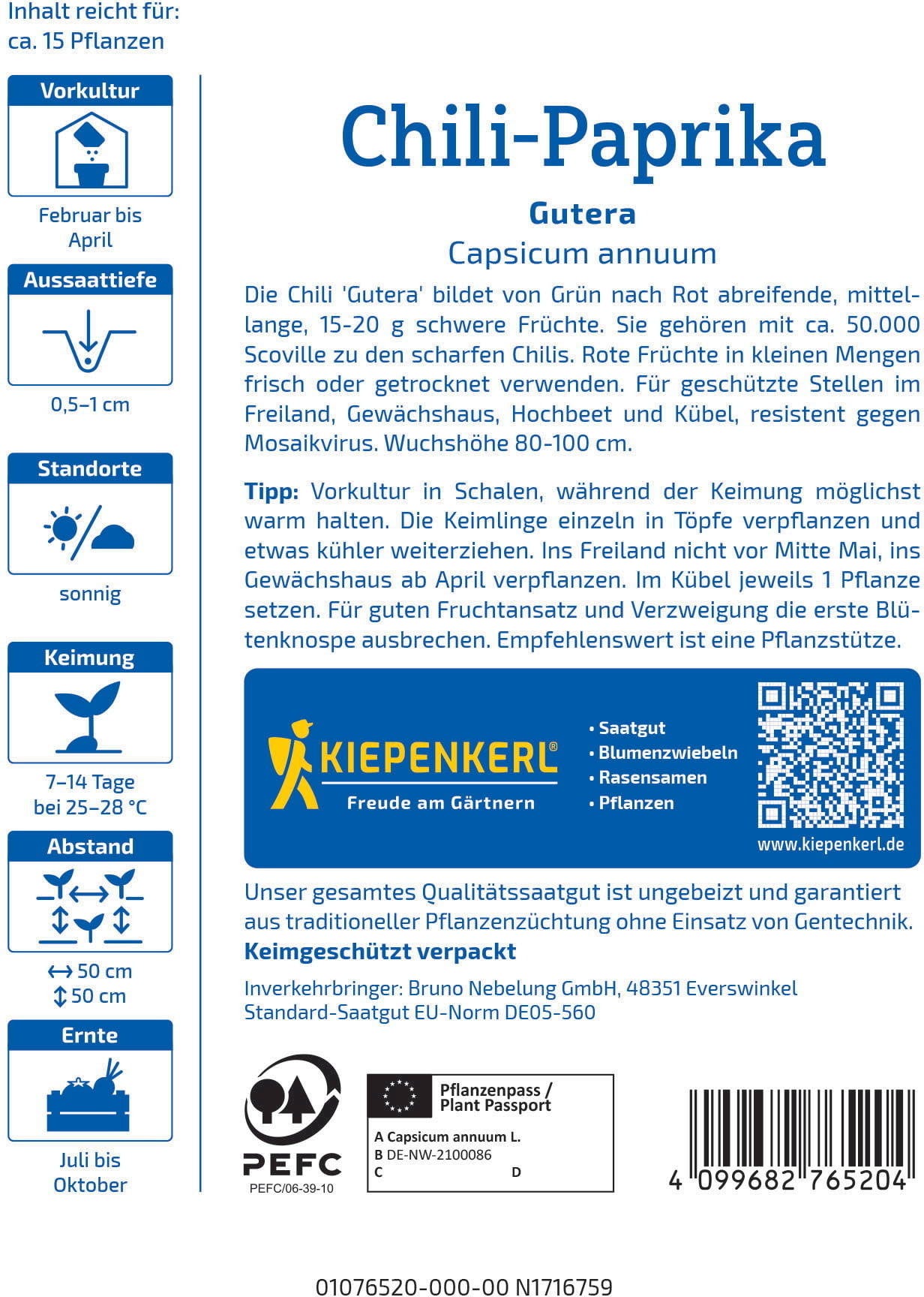 Sorta čili paprike "Gutera" prinaša začimbe in barve na vaš vrt. Njeni pekoči, živo rdeči plodovi niso le privlačni za oči, ampak jedem dajejo tudi močan pečat. Ta robustna sorta je enostavna za gojenje na prostem, v gredah ali posodah in vas dolgo časa nagradi s pridelkom, polnim aromatičnih čili paprik.