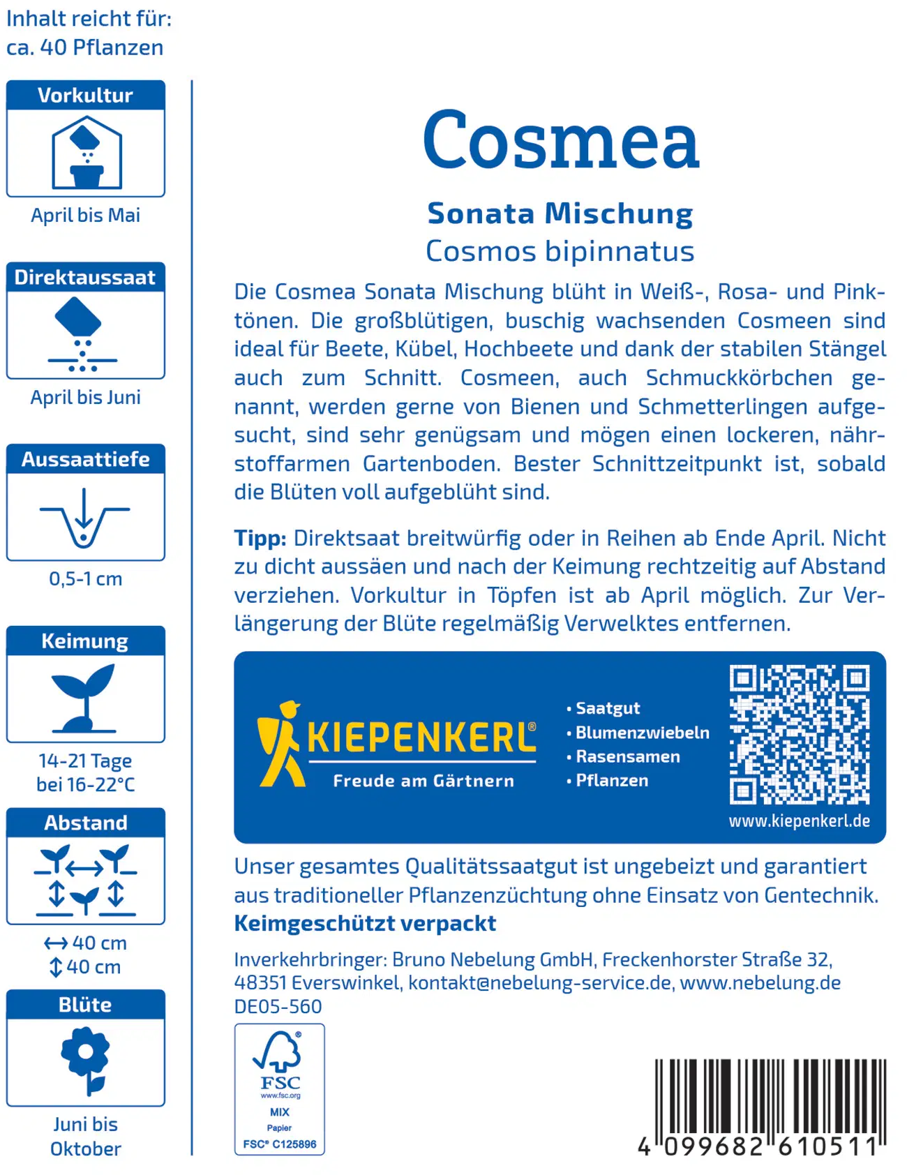 Semena kozmej "Sonata Mix" pričarajo pisano morje cvetov v belih, rožnatih in rožnatih odtenkih. Grmičaste rastline so idealne za cvetlične grede in lonce, zaradi trdnih stebel pa so idealne tudi kot rezano cvetje. Njihovi cvetovi privabljajo žuželke in vsakemu vrtu dodajo živahno barvo. Enostavna so za nego, vsestranska in popolne za prinašanje veselja in naravne lepote v vašo zeleno oazo.
