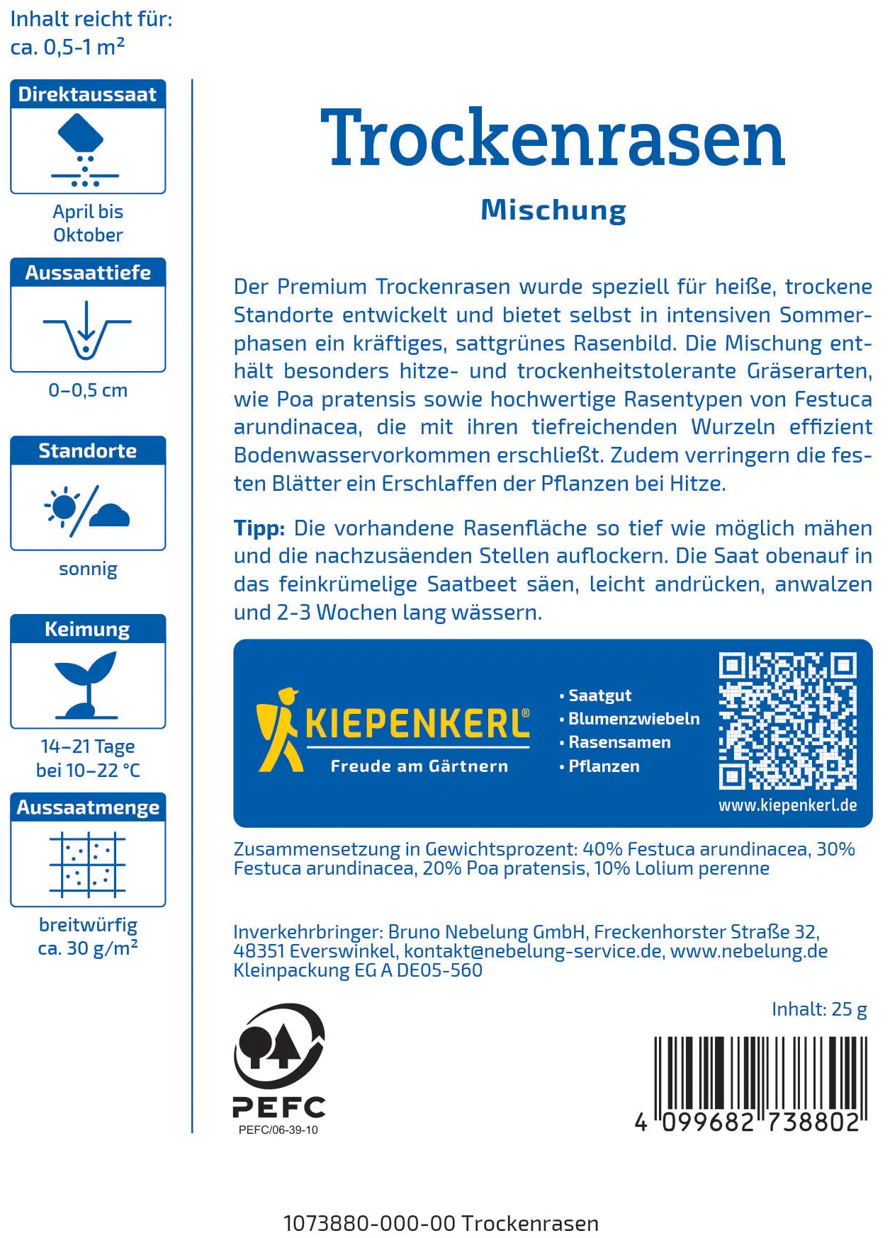 Kiepenkerl Profi-Line Premium seme za trato za suho travišče je posebej razvito za vroče in suhe lokacije. Sorte trave, odporne na vročino in sušo, zagotavljajo bujno, zeleno in gosto trato, ki ostane lepa tudi pod močnim soncem. Idealno za domače vrtove, trate in igrišča – za optimalno kalitev preprosto posejte, rahlo pritisnite in redno zalivajte.