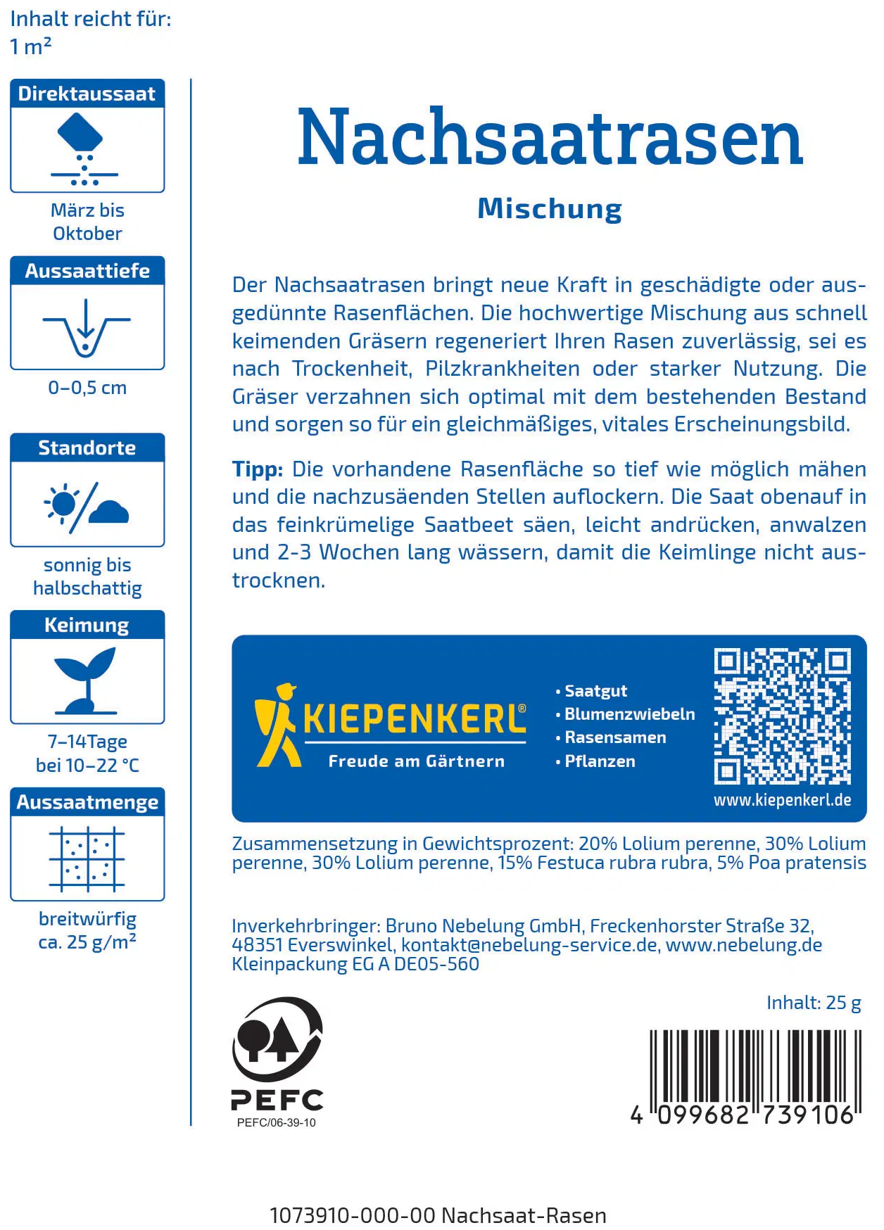 Seme za ponovno setev trate znamke Kiepenkerl zanesljivo obnovi poškodovano ali razredčeno trato. Hitro kaljive trave se optimalno povežejo z obstoječo travo in zagotovijo gosto, vitalno trato. Idealno za domače vrtove, trate in igrišča - primerno tudi za robotske kosilnice. Enostavna setev in hitra regeneracija za enakomerno zeleno, odporno trato.