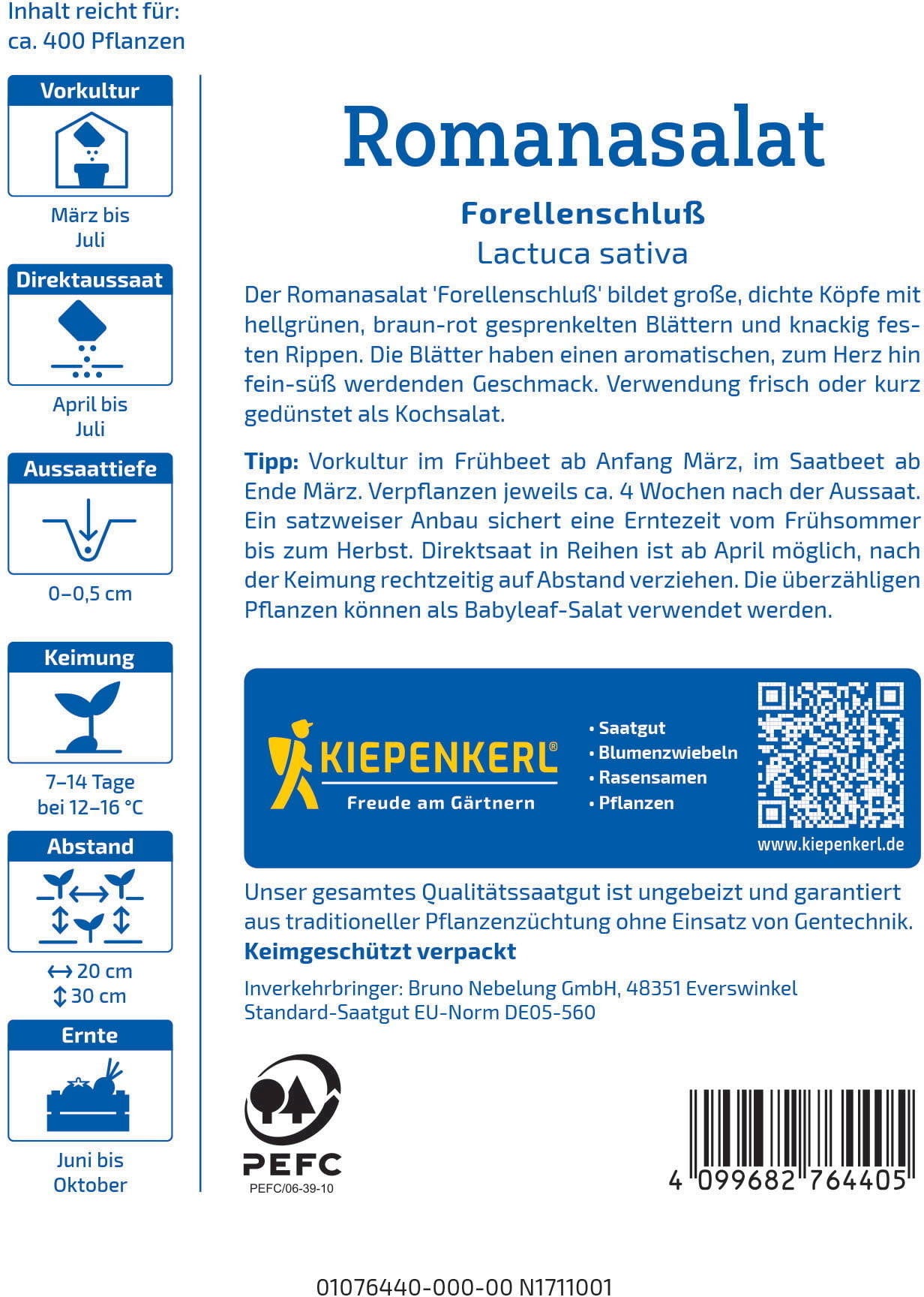 Solata "Forellenschluß" prinaša barvo, svežino in okus neposredno na vaš vrt. Zaradi lepih pikčastih listov solata ni le okusna, temveč tudi privlačna na krožniku. Hrustljava in sveža v solati ali na kratko podušena obogati vsak obrok - dolga sezona žetve pa zagotavlja stalno oskrbo s svežimi, doma pridelanimi listi solate.
