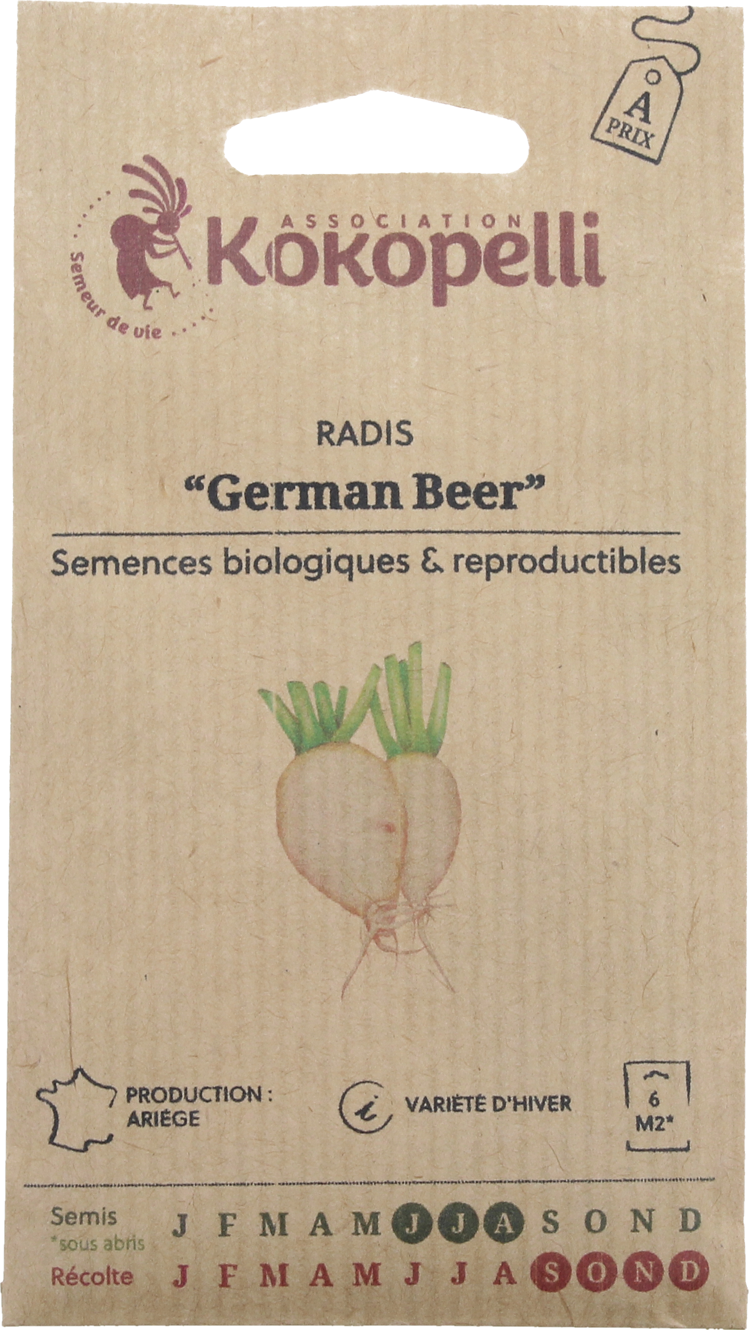 Nemška pivska redkev daje bele korene v obliki repe s čvrsto in sladko teksturo. Ta stara sorta, ki se tradicionalno uživa s pivom ali sladkorjem, je robustna in primerna za poznopoletno do zimsko pridelavo. Idealna za vrtne grede ali lonce.