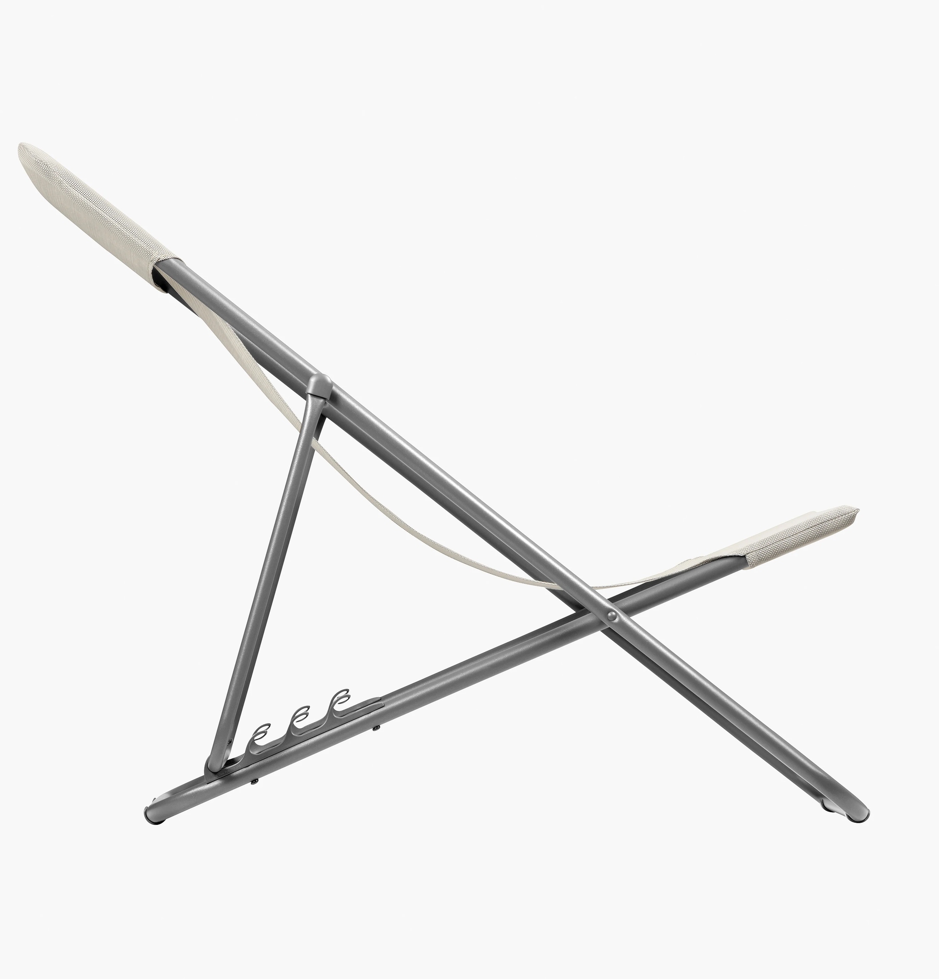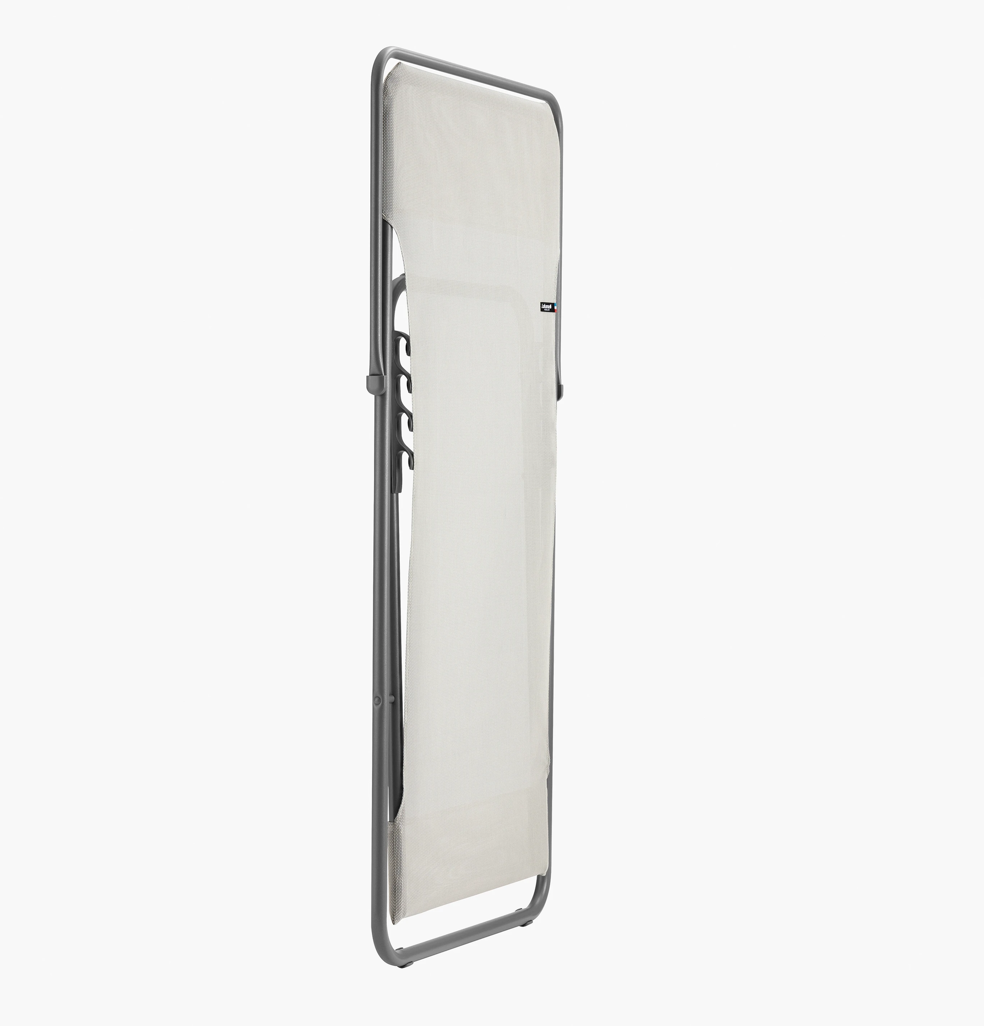Ta ležalnik vas bo navdušil s širšim okvirjem, ki znaša skupno kar 62 cm. Prevleka je zračna in priročno odstranljiva. Tkanina je dodatno ojačana pod koleni. Ko je zložen, meri ležalnik v debelino le 6 cm, zato z njim prihranite prostor. Štirje nastavljivi položaji zagotavljajo maksimalno prilagoditev in udobje.