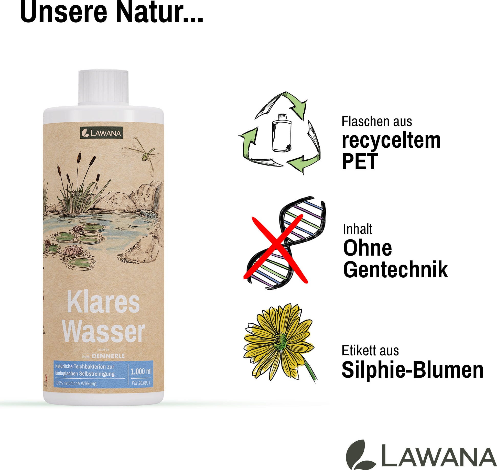 Naj gre za novo ureditev, uporabo po menjavi vode ali ob velikem številu rib – Bistra voda znamke LAWANA poskrbi za odlične rezultate in impresivno vidljivost v ribnikih s krapi koi, plavalnih ribnikih ali klasičnih vrtnih ribnikih. Poseben bonus: sredstvo sploh ne vsebuje gensko spremenjenih organizmov in predstavlja naravno nego za vašo vodo!