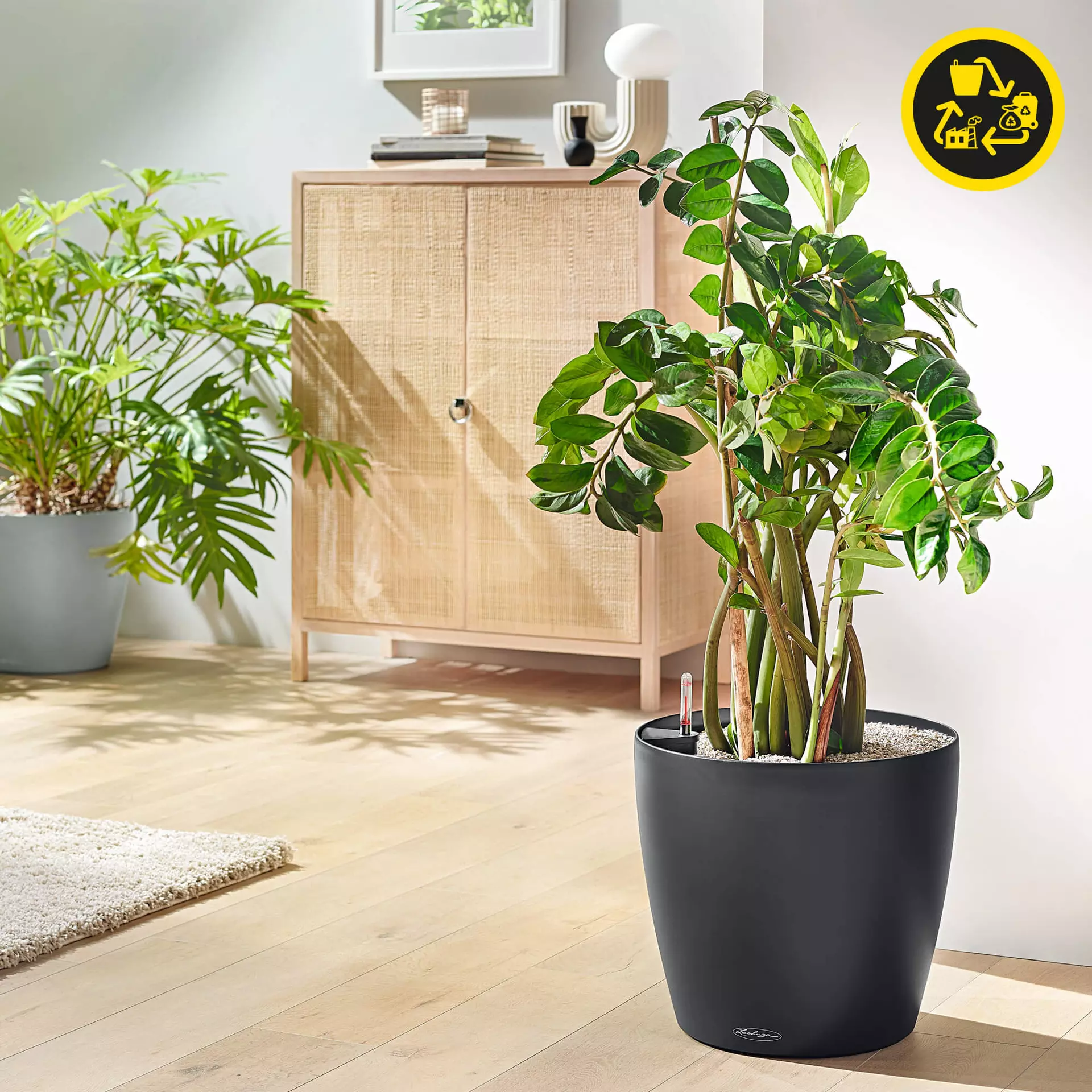 Cvetlični lonci CLASSICO Color znamke Lechuza so v celoti izdelani iz reciklirane plastike. Tako ustvarjamo trajnostno gospodarstvo z zniževanjem izpustov CO2, ki predeluje lastne proizvodne odpadke in plastične odpadke iz rumenega zabojnika v elegantne cvetlične lonce odlične kakovosti Lechuza.