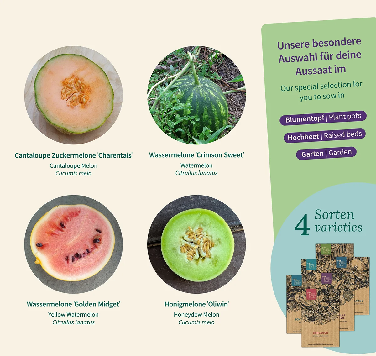 Popoln set za vse ljubitelje melon! V tej skrbno sestavljeni škatli najdete štiri različne sorte semen, ki dobro uspevajo tudi v srednjeevropskem podnebju in vam s čudovito aromatičnim okusom posladkajo poletje.