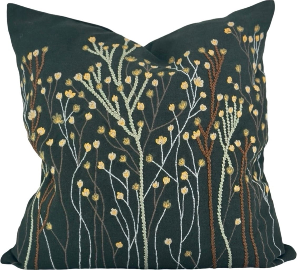 Prevleka za blazino "Paniculata Moss" bo vašemu domu zagotovila naravno, mirno vzdušje. Temno zeleno bombažno tkanino dopolnjujejo nežni vezeni cvetni popki v toplih zemeljskih barvah - prava paša za oči na kavču ali postelji.
