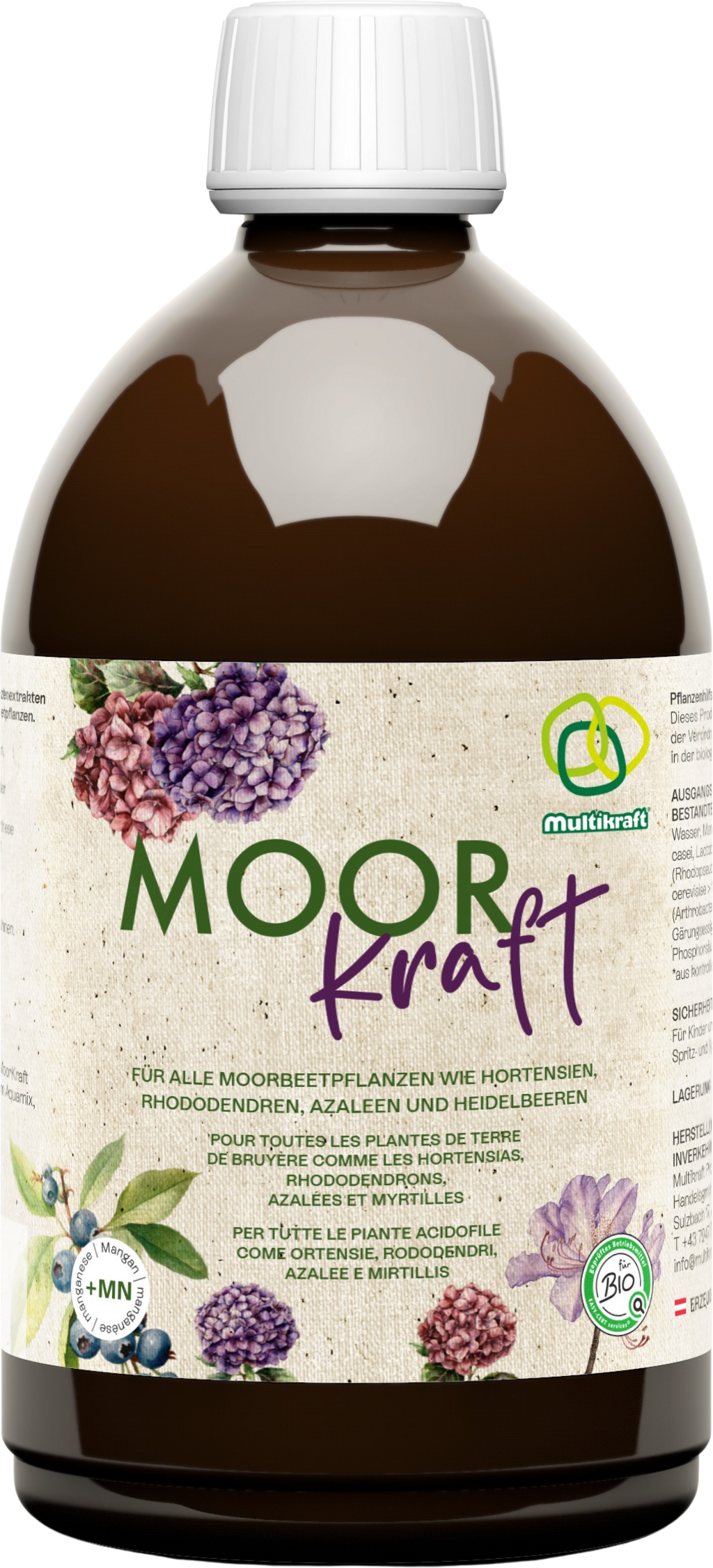 MOORkraft vašim kisloljubnim rastlinam zagotavlja močno kombinacijo učinkovitih mikroorganizmov, rastlinskih izvlečkov in mangana. To omogoča hortenzijam, rododendronom, azalejam in borovnicam, da veliko učinkoviteje absorbirajo hranila. Rezultat: bujno zeleno listje, obilno cvetenje in zdrave, živahne rastline, ki jih lahko resnično vidite.