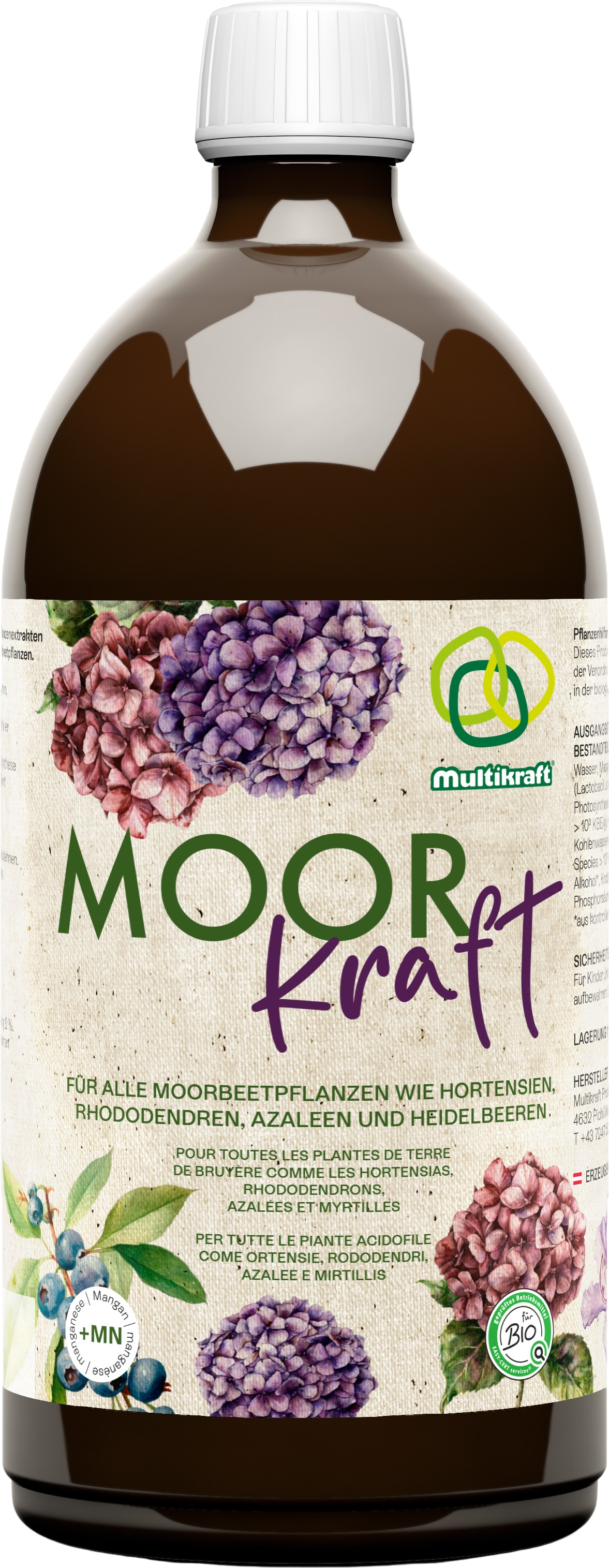 MOORkraft vašim kisloljubnim rastlinam zagotavlja močno kombinacijo učinkovitih mikroorganizmov, rastlinskih izvlečkov in mangana. To omogoča hortenzijam, rododendronom, azalejam in borovnicam, da veliko učinkoviteje absorbirajo hranila. Rezultat: bujno zeleno listje, obilno cvetenje in zdrave, živahne rastline, ki jih lahko resnično vidite.
