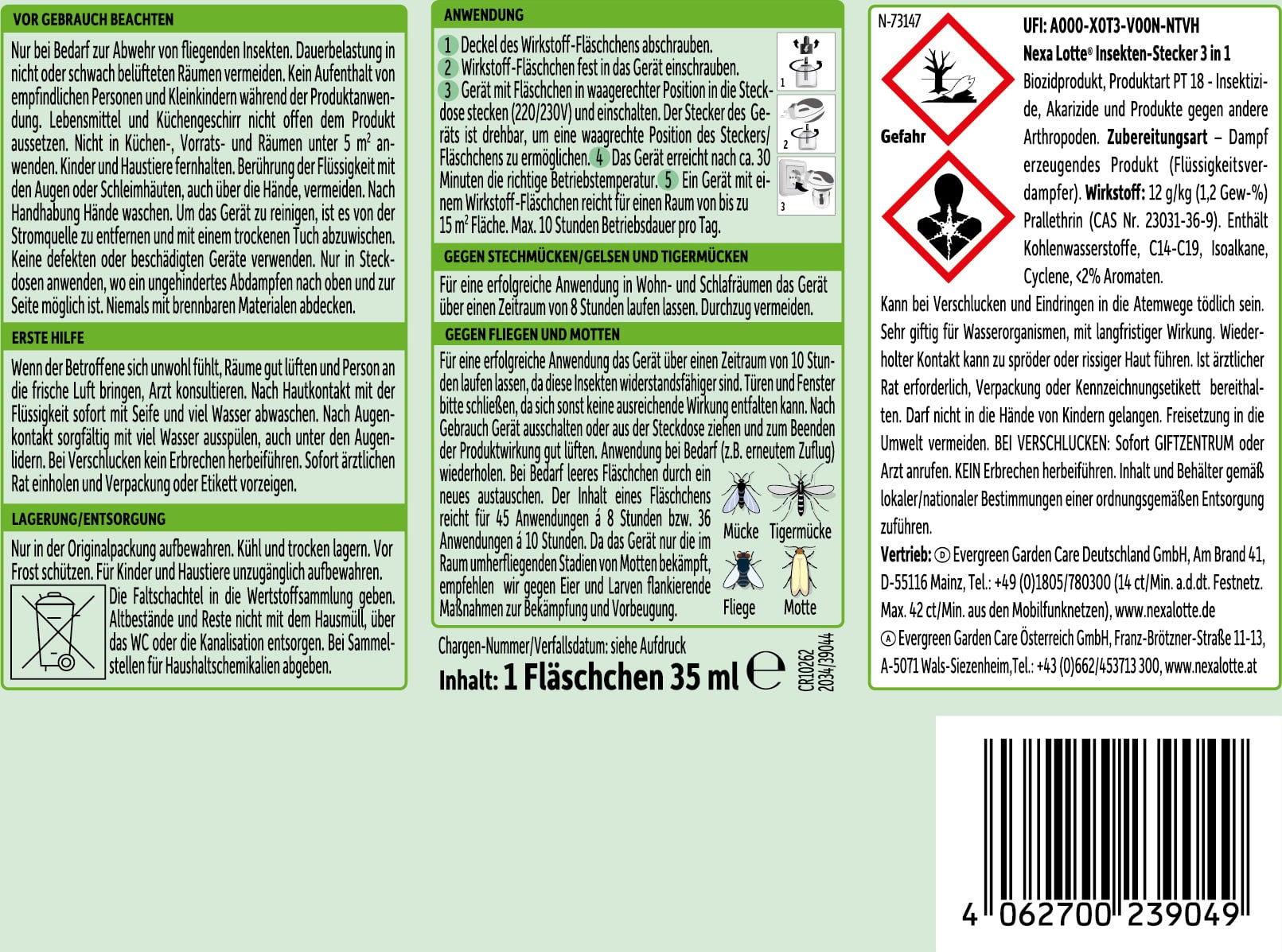 Polnilna steklenička za električni aparat proti insektom nudi zanesljivo zaščito pred komarji, muhami in molji – popolnoma brez neprijetnega vonja. Preprosto jo vstavite, priključite in aktivna sestavina se enakomerno porazdeli po prostoru. To vam omogoča miren spanec, ne da bi vas zbudili brenčeči insekti. Idealno za vse bivalne prostore in tudi za potovanje z avtodomom ali počitniško hišo.