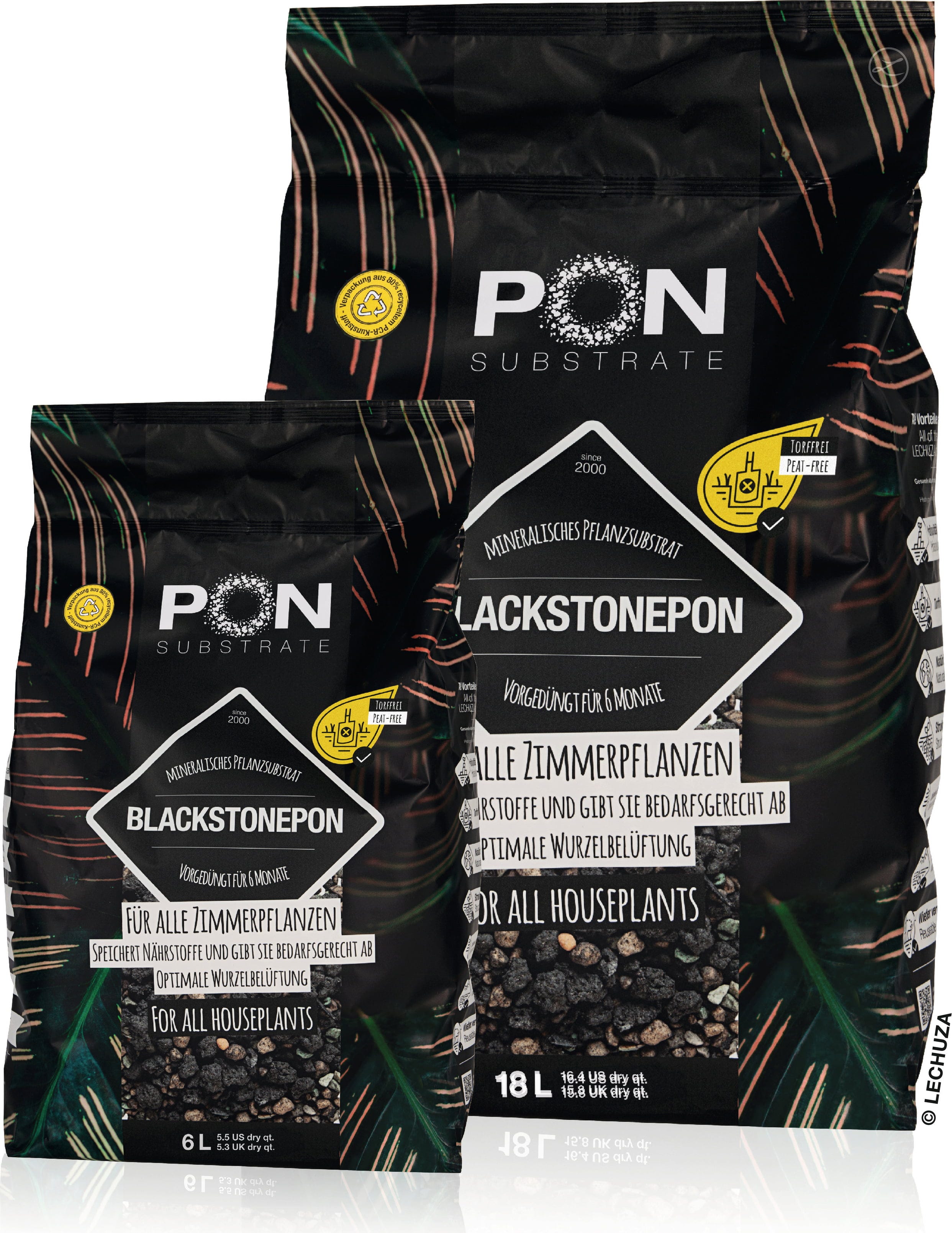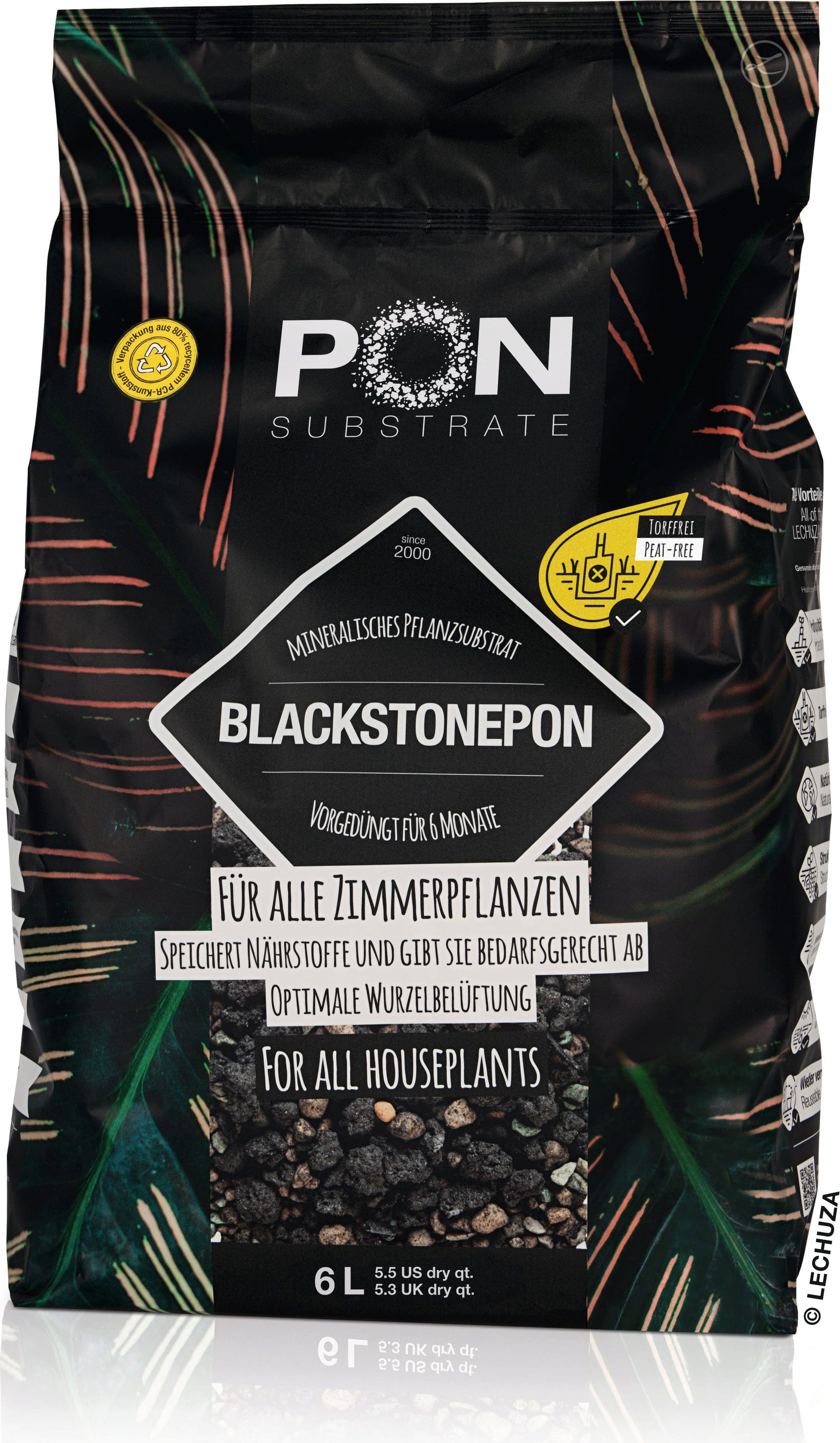 Ne glede na to, ali želite popolnoma presaditi svoje sobne rastline ali pa iščete le dekorativno okrasno plast - Blackstonepon zlahka preseže običajno zemljo za lončnice. Je izjemno strukturno stabilen, se ne zbija in zagotavlja odlično drenažo. Temno barvo uporabite kot eleganten kontrast bujnim zelenim listom.