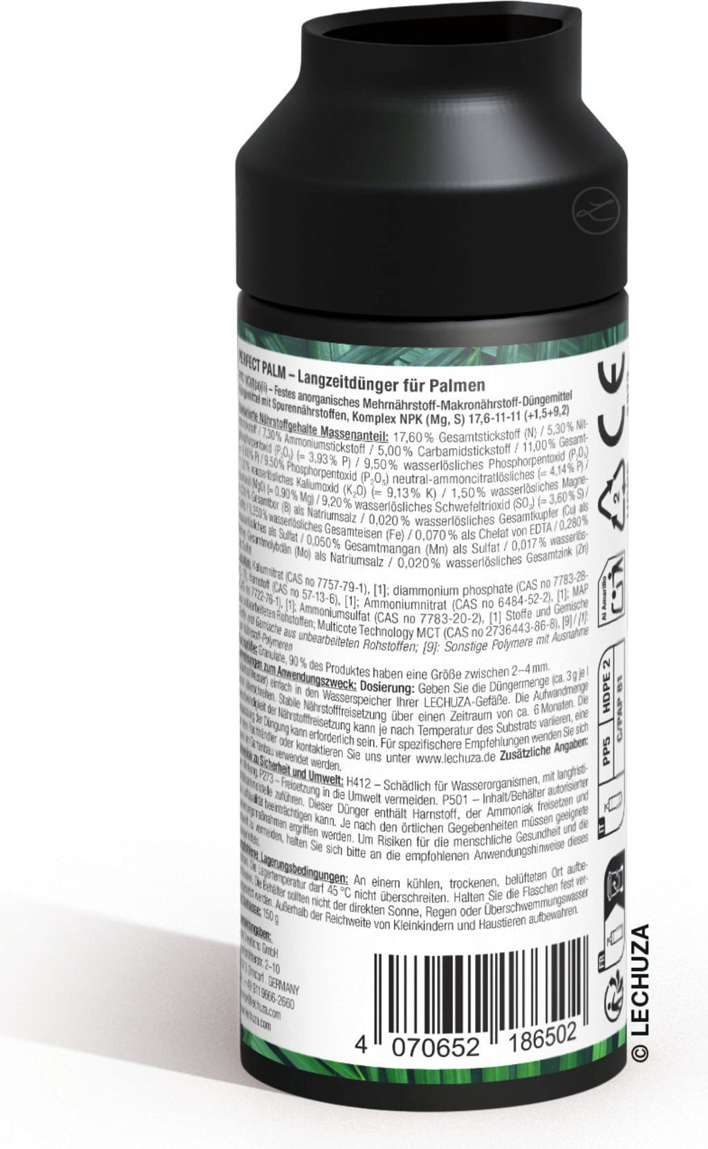 Vaše palme imajo visoke zahteve, vendar nimate časa za zapletene postopke gnojenja? Ni problema! Gnojilo Perfect Palm s počasnim sproščanjem opravi delo namesto vas. Preprosto ostane v rezervoarju za vodo in 6 do 8 mesecev hrani vaše rastline z vsem, kar potrebujejo za bujne zelene liste. Gnojenje enkrat na sezono je vse, kar potrebujete, da lahko kot lastnik rastlin vedno pokažete najlepšo plat svoje notranje džungle.
