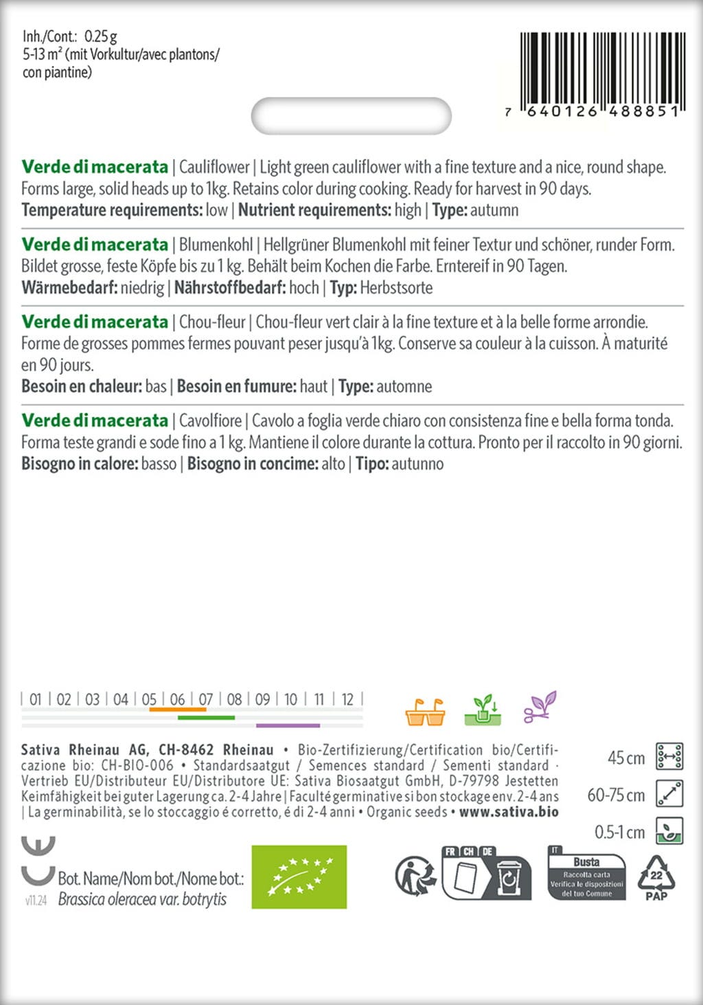 Svetlo zelena cvetača "Verde di macerata" navdušuje s svojo fino teksturo in lepo okroglo, kompaktno obliko. Oblikuje velike, čvrste glave s težo do 1 kg in ohrani privlačno barvo tudi po kuhanju. Za obiranje je pripravljena po približno 90 dneh in izvira iz skrbnega ohranitvenega žlahtnjenja podjetja Sativa iz Rheinaua.