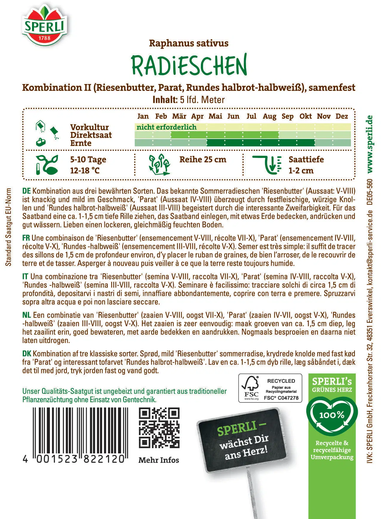Redkvice "Kombination II" znamke SPERLI združujejo tri sorte: 'Riesenbutter' s posebno velikimi gomolji, 'Parat' kot klasično redkev brez puhaste teksture in 'Rundes halbrot-halbweiß' za vizualne poudarke. Zaradi praktičnega traku za seme lahko setev opravite hitro in enakomerno. Na sončnih do polsenčnih legah lahko hrustljave redkvice pridelujete od maja do oktobra.