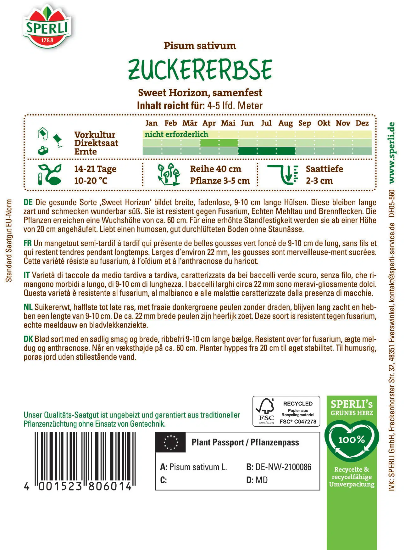 Pri sorti 'Sweet Horizon' lahko pridelujete svoj nežni sladki grah! Rastline se ponašajo s temno zelenimi stroki brez niti, dolgimi 9–10 cm in širokimi približno 2 cm. Ta robustna sorta je odporna na ožig, fuzarijsko uvelost in pepelasto plesen ter uspeva tako na soncu kot v delni senci. Svež grah lahko pobirate že od junija naprej in ga uživate do avgusta – prava poslastica z vašega vrta.