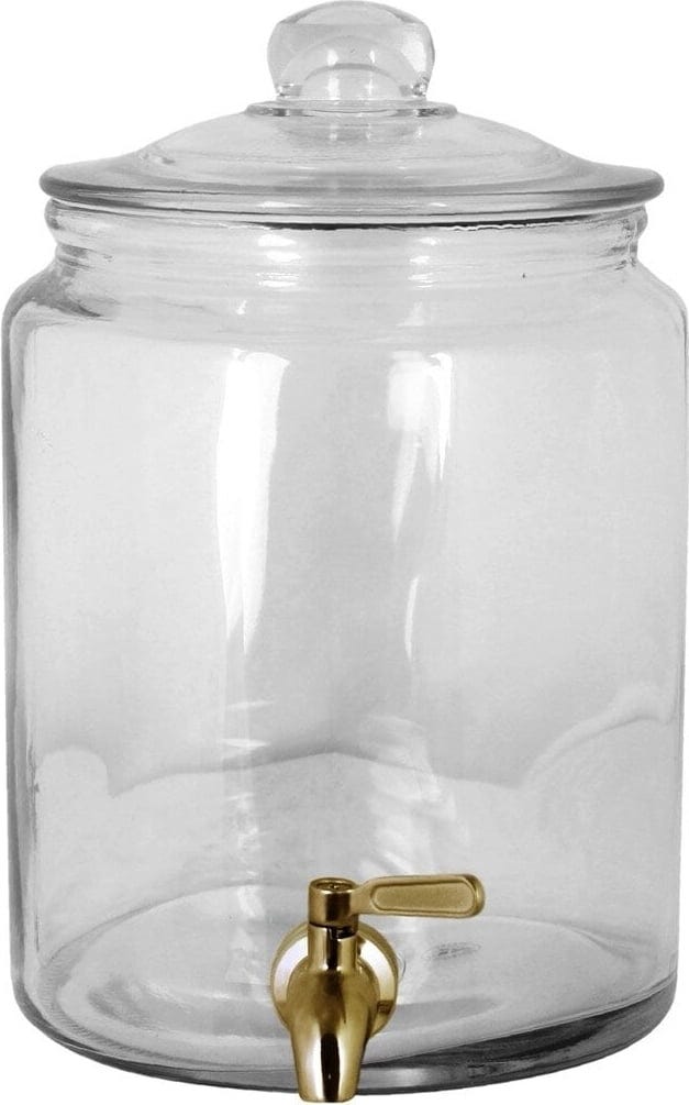 Steklena posoda z medeninasto pipo je popolna za pijačo na zabavah, na vrtu ali ob prijetnih trenutkih doma. Tesno zaprt pokrov ohranja vsebino svežo, medtem ko velika odprtina olajša polnjenje in točenje. Praktično, stilsko in prava paša za oči na vsaki mizi.